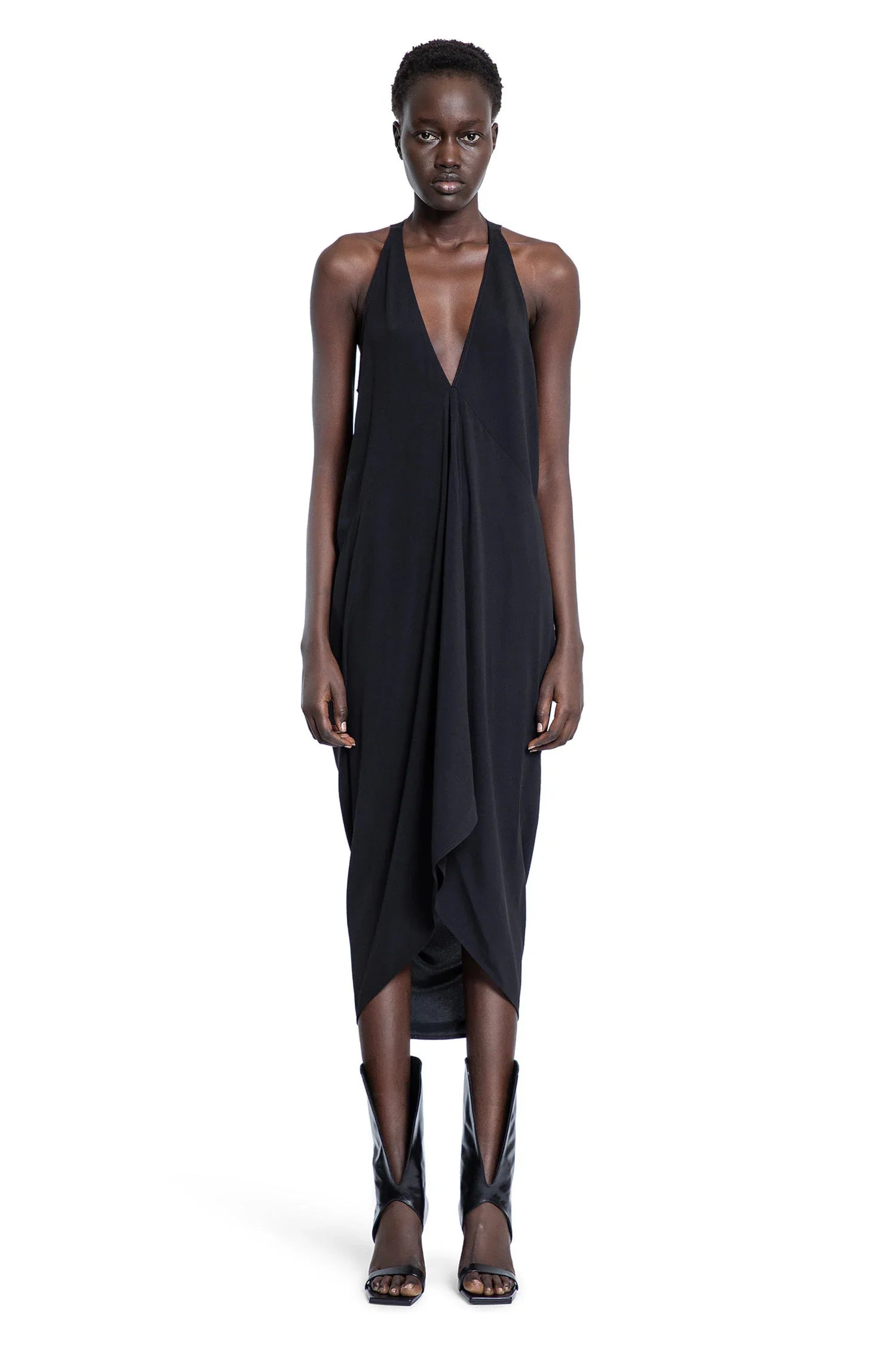 DESCRIPTION - Black - Cady crepe - Gathered deep plunging neckline - Sleeveless - Asymmetric hem - Draped DETAILS - Made in: Italy - Composition: 50% Acetate 50% Viscose - Model code: RP01E7568Y 09 - Item ID: 9452821119318 SIZE & FIT Model wears size 42 Model Height 177 cm Bust 77 cm Waist 59 cm Hips 86 cm