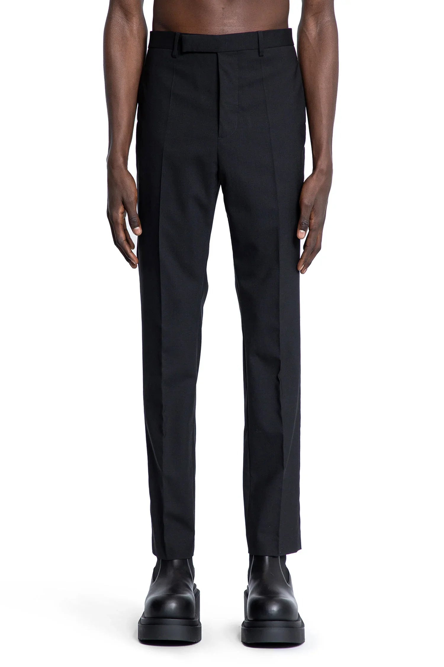 DESCRIPTION - Black - Paper finish wool - Belt holes - Hook and zip closure - Leg crease - Side pockets - Back buttoned pockets - Extra slim fit DETAILS - Made in: Italy - Composition: 96% Wool 4% Elastane - Model code: RU01E5357ZL 09 - Item ID: 9460286292310 SIZE & FIT Model wears size 48 Model Height 190 cm Chest 87 cm Waist 73 cm Hips 88 cm