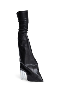 DESCRIPTION - Runway style - Black - Sretch lamb leather and soft grain cow leather - Pointed toe - Paltform - Fitted sock upper - Knee height - Diagonal seam line that drops from front, over the - knee towards back calf - Concealed wedge heel DETAILS - Made in: Italy - Composition: 65% Lambskin 34% Cotton 1% Elastane 100% Bovine Leather - Model code: RO01E7843LSLCN0 90 - Item ID: 9541124096342