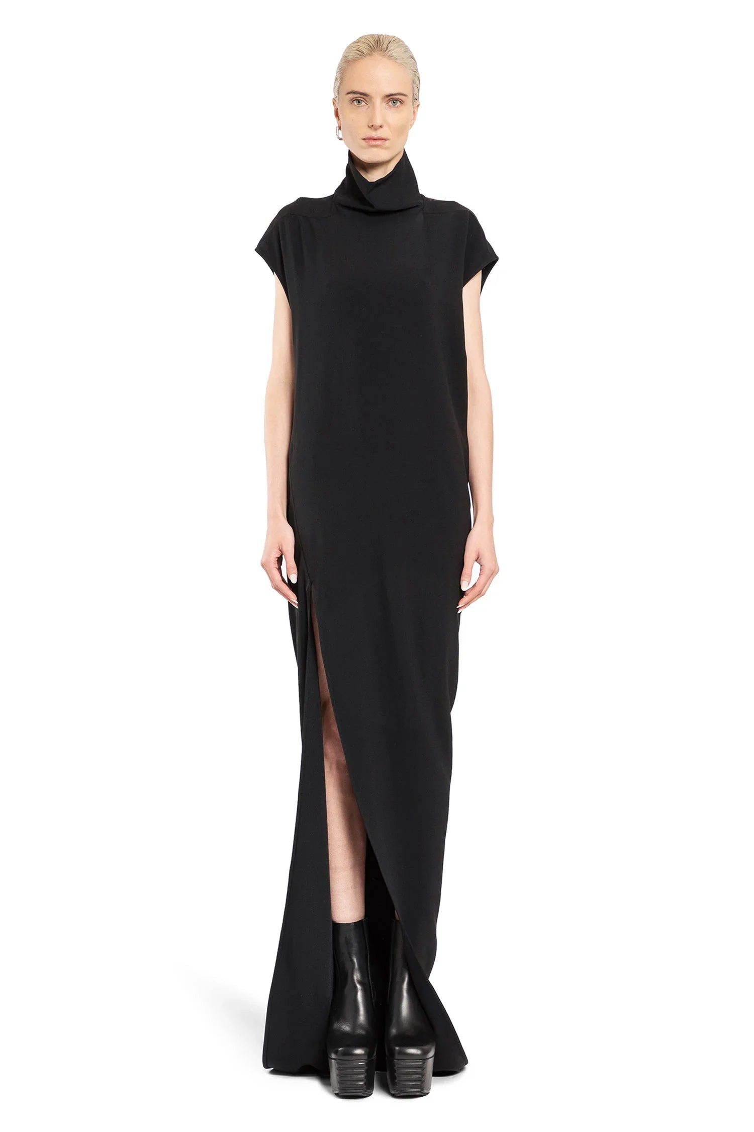 DESCRIPTION - black - Heavy cady - turtleneck - signature square shoulder seams - short cap sleeves - side split - back button closure - floor length - loose fit DETAILS - Made in: Italy - Composition: 53% Viscose 47% Acetate - Model code: RP02D3503HY 09 - Item ID: 9003668472150 SIZE & FIT Model wears size 40 Model Height 180 cm Bust 80 cm Waist 59 cm Hips 89 cm