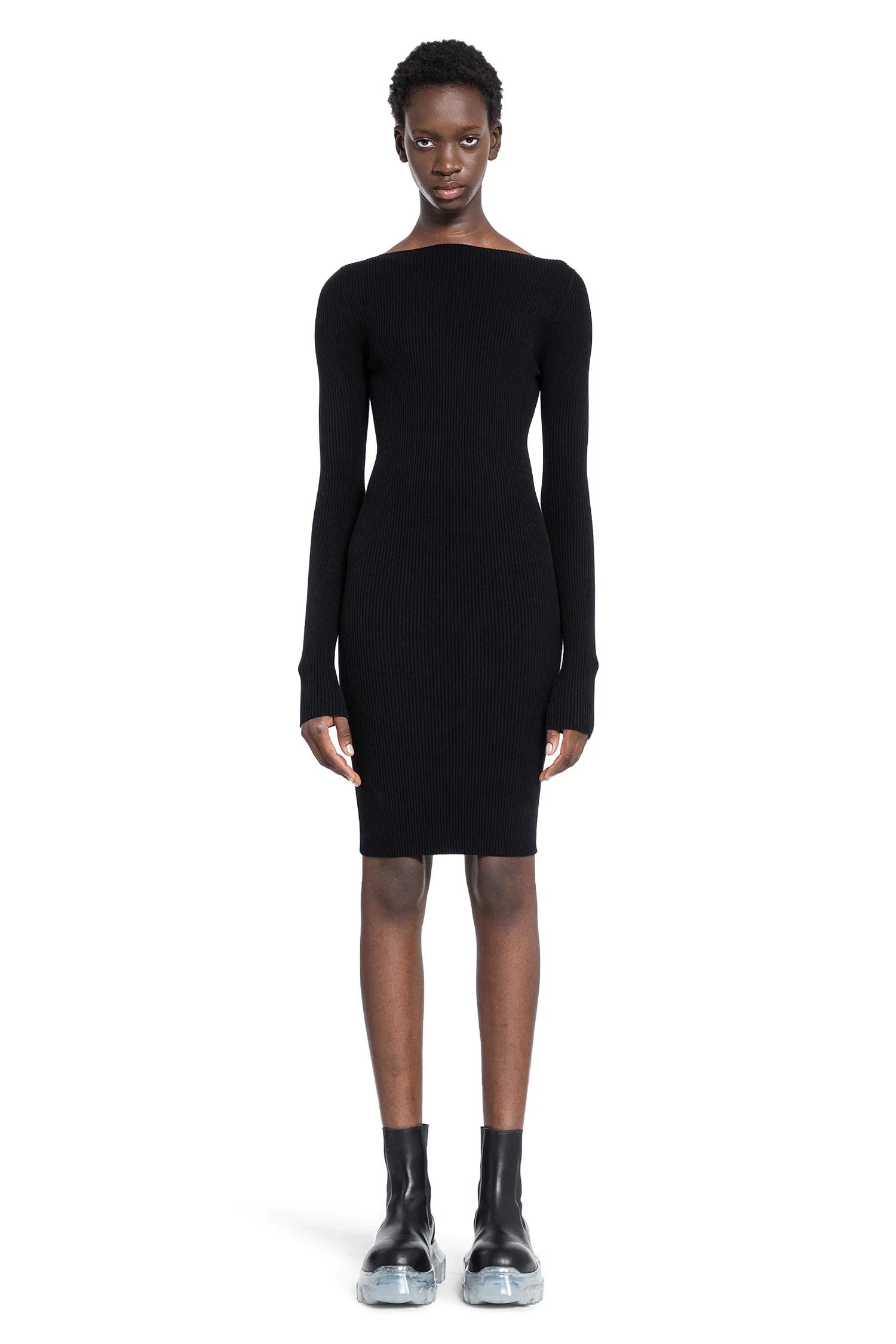 DESCRIPTION - black - stretch jersey - ribbed-knit - boat neckline - long sleeves - back cut-out - back signature seams - fitted DETAILS - Made in: Italy - Composition: 68% Viscose 32% Polyester - Model code: RP02D3616RIBVI 09 - Item ID: 9046771761494 SIZE & FIT Model wears size S Model Height 177 cm Bust 77 cm Waist 59 cm Hips 86 cm