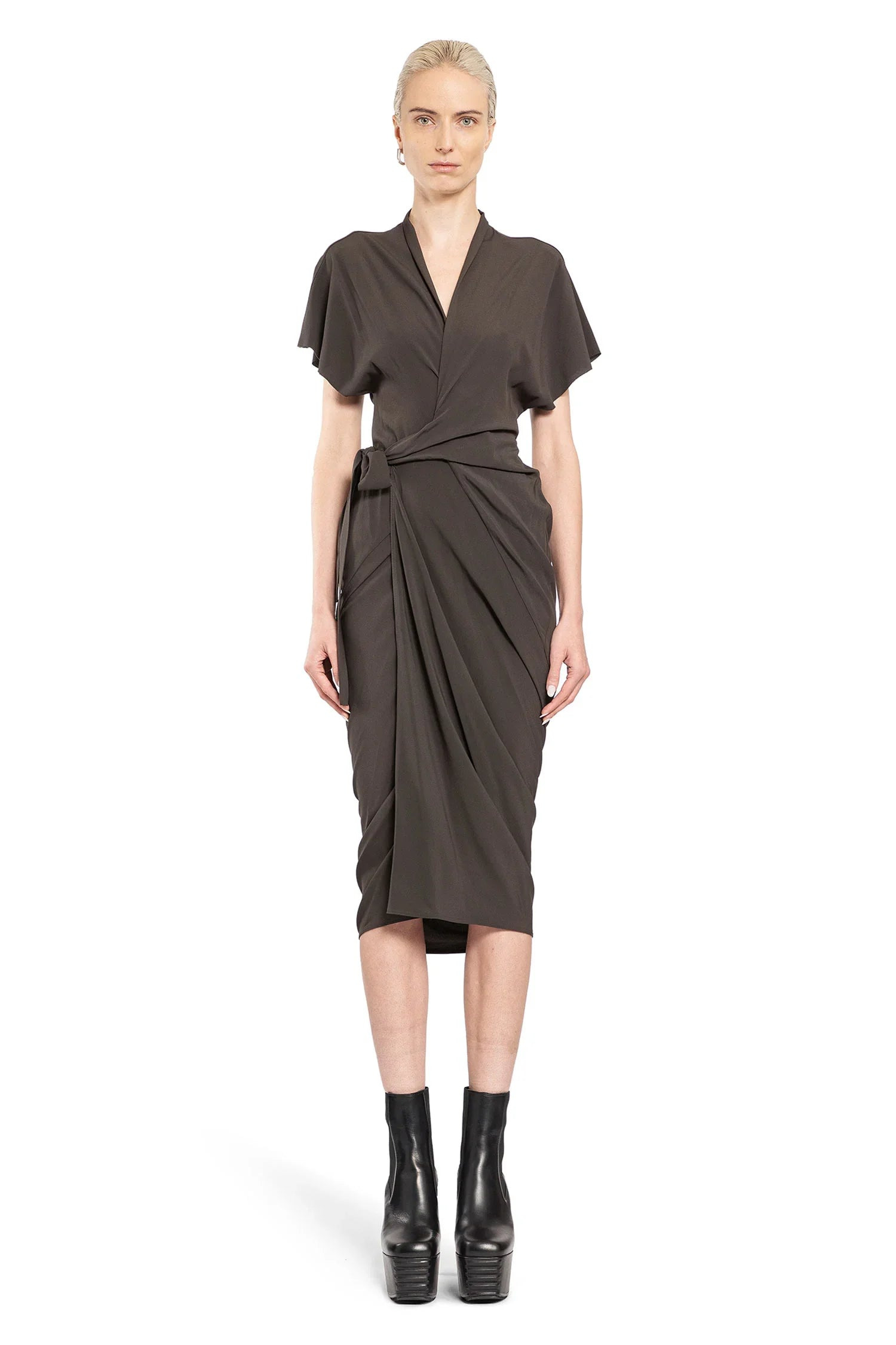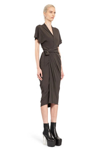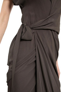 DESCRIPTION - dark dust - Cocoon Crepe - v-neck - self-tie belt - short sleeves - ruched front - draped back DETAILS - Made in: Italy - Composition: 64% Acetate 36% Silk - Model code: RP02D3542CC 78 - Item ID: 9003692786006