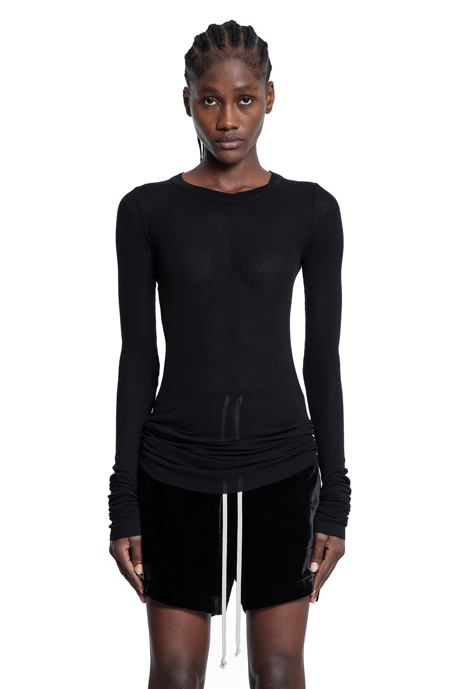 DESCRIPTION - Black - Viscose silk jersey - Round neck - Long sleeves - Back signature seam - Raw-edge hem and cuffs - Slim fit DETAILS - Made in: Italy - Composition: 88% Viscose 12% Silk - Model code: RP02E4202RC 09 - Item ID: 9668724031830 SIZE & FIT Model wears size 40 Model Height 176 cm Bust 77 cm Waist 60 cm Hips 87 cm
