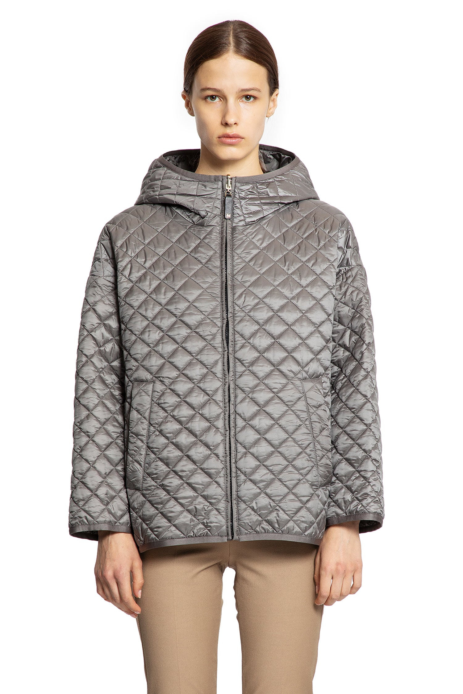 DESCRIPTION - Dark grey - Padded diamond quilting - Water-repellent - Reversible - Fixed hood - Zip closure - Side pockets - Dropped shoulders - Reverse: - Solid nylon with cameluxe logo print - Slightly flared fit DETAILS - Made in: Italy - Composition: 100% Polyester Padding: Polyester/Wool/Silk - Model code: 2529486074600 024 - Item ID: 9719297179990 SIZE & FIT Model wears size 38 Model Height 178 cm Bust 84 cm Waist 60 cm Hips 88 cm
