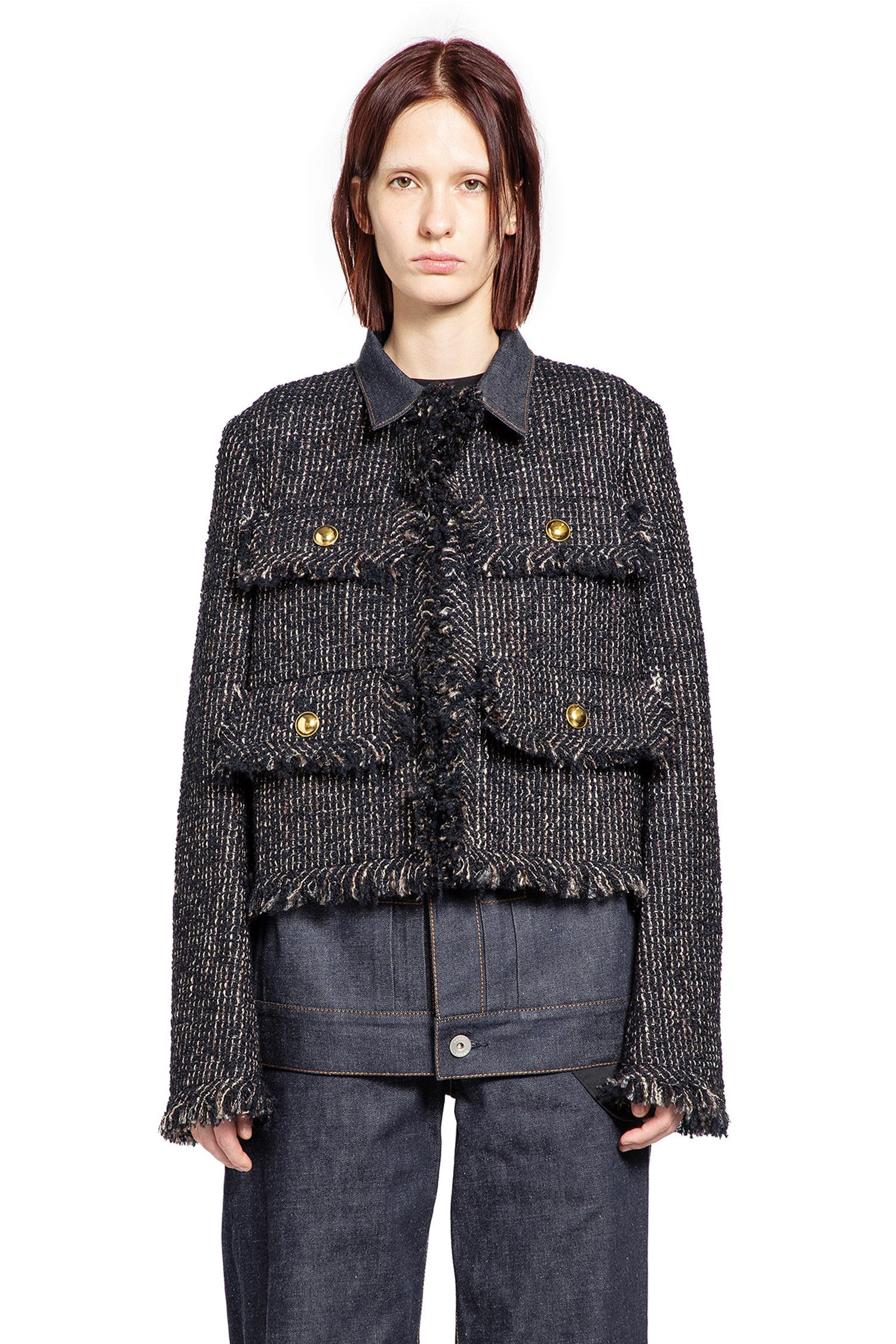 DESCRIPTION - Multicolor - Black/white/brown/indigo - Spliced tweed and denim - Fringed trim - Denim collar - Concealed button closure - Button flap chest pockets - Side button flap pockets - Layered hem - Dropped shoulders - Back buttoned waist tabs - Layered hem - Fringed hem and cuffs DETAILS - Made in: China - Composition: 80% Wool 13% Acrylic 7% Polyester 100% Cotton - Model code: 2508045 225 - Item ID: 9765181096278