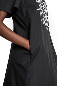 DESCRIPTION - Black - Polyester cotton poplin - Round neck - Asymmetric pleats - Bias cut - Front ''where the wild things are'' graphic print - Dropped shoulders - Short sleeves - Back zip closure DETAILS - Made in: Japan - Composition: 65% Polyester 35% Cotton - Model code: 2508022 001 - Item ID: 9706230055254 SIZE & FIT Model wears size 3 Model Height 180 cm Bust 77 cm Waist 57 cm Hips 97 cm