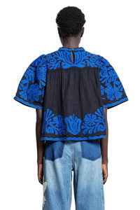 DESCRIPTION - Multicolor - Black/blue - Seasonal embroidery - Stand collar - Front pleats - Short puff sleeves - Back button closure - Boxy fit DETAILS - Made in: India - Composition: 87% Cotton 13% Linen - Model code: RS25072 - Item ID: 9446275121494 SIZE & FIT Model wears size S Model Height 177 cm Bust 77 cm Waist 59 cm Hips 86 cm