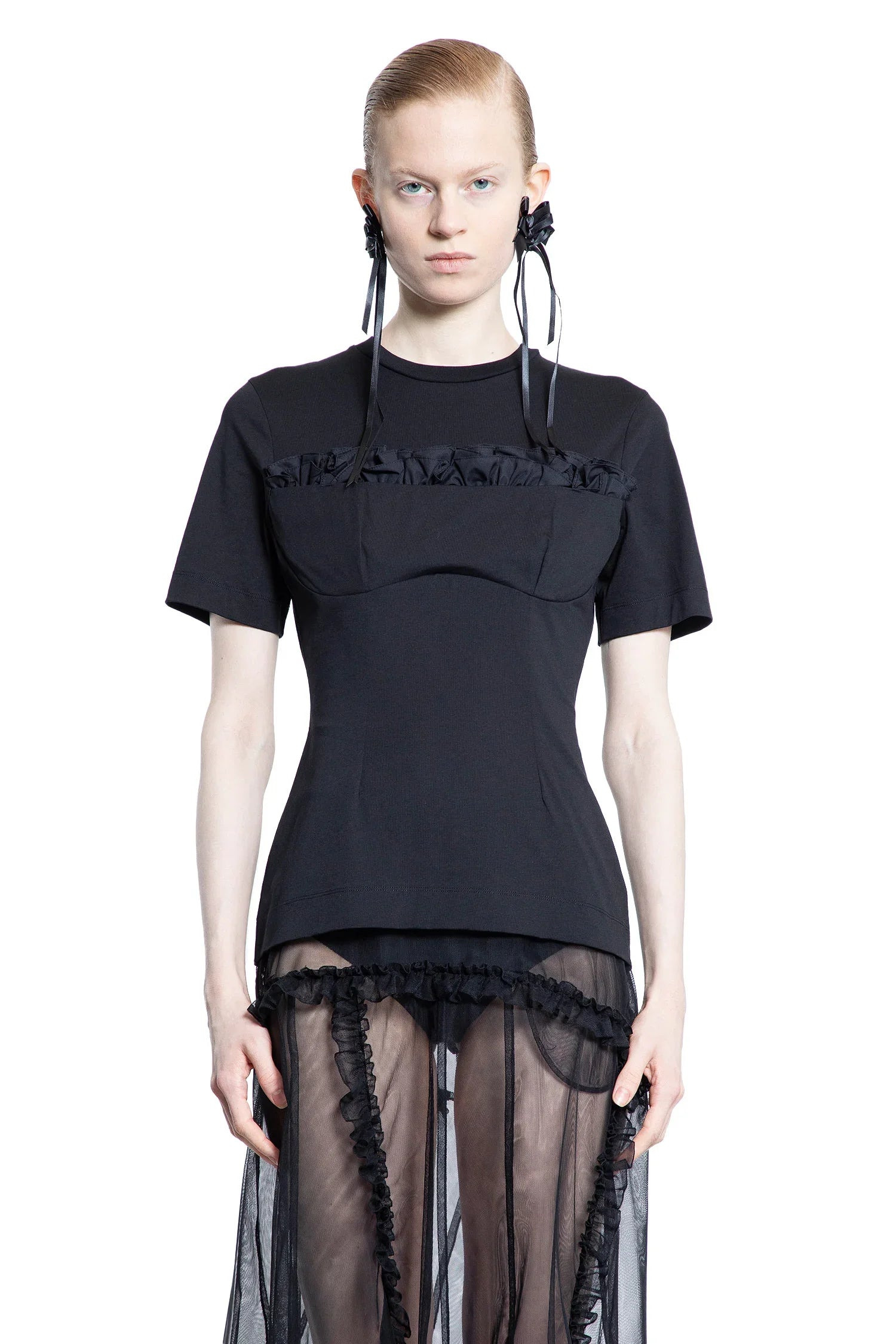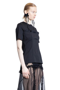 DESCRIPTION - Black - Cotton jersey - Round neck - Balconette bust with ruffled trim - Dropped shoulders - Short sleeves - Slim fit DETAILS - Made in: Portugal - Composition: 100% Cotton - Model code: 53230553 BLACK - Item ID: 9404282700118 SIZE & FIT Model wears size S Model Height 180 cm Bust 82 cm Waist 61 cm Hips 86 cm