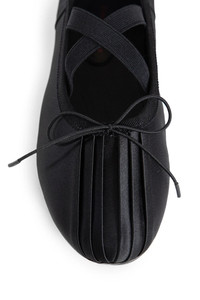 DESCRIPTION - Runway style - Black - Satin - Grosgrain trim - Pleated front - Front rope bow - Crossed elasticated straps - Back pull tab - Rubber sole DETAILS - Made in: Portugal - Composition: 100% Polyester - Model code: BPT1M0755 BLACK - Item ID: 9534056530262