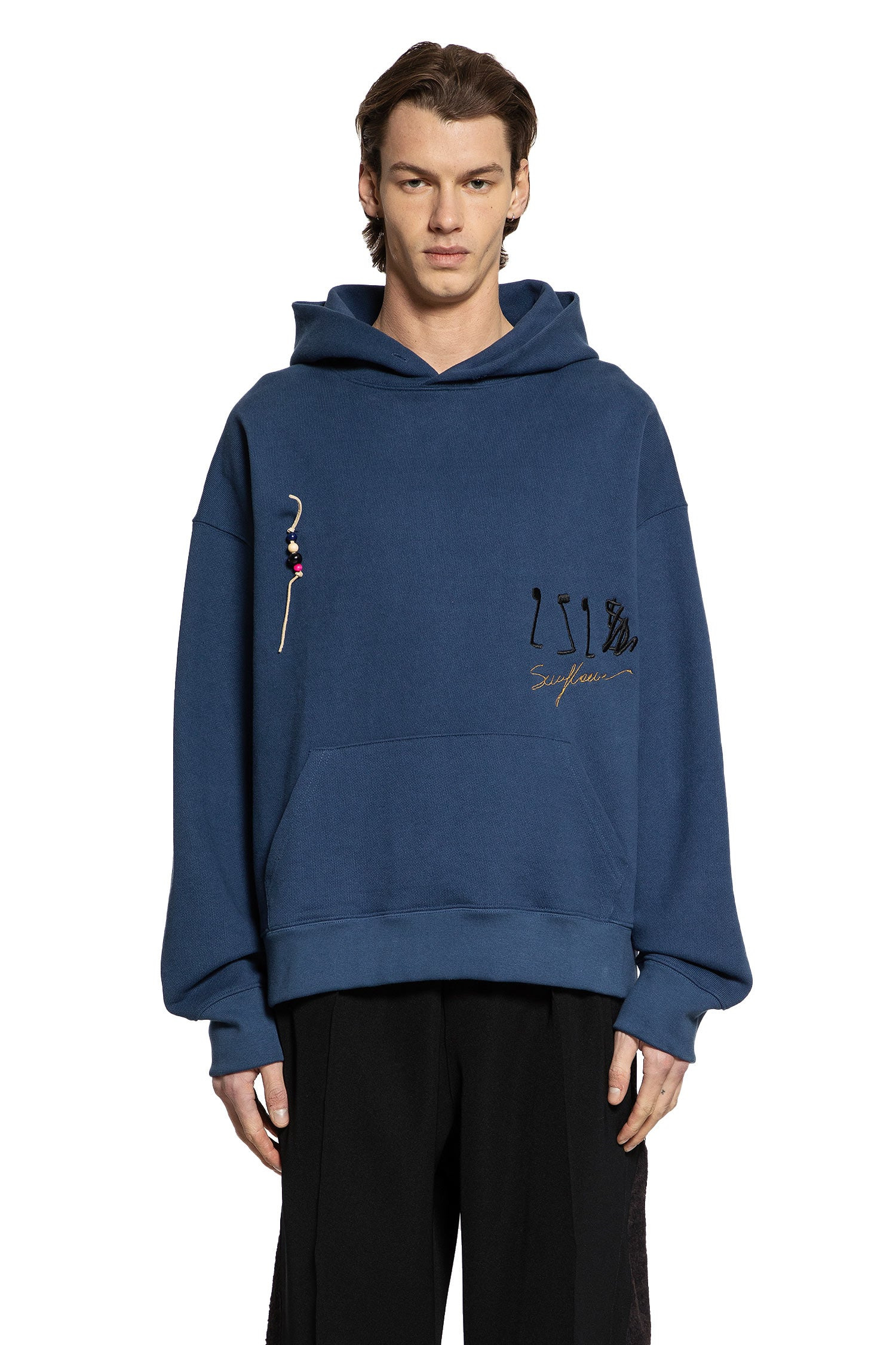 DESCRIPTION - Blue - Terry - Fixed hood - Front wooden bead and leather trim - Embroidered logo detail - Elongated sleeves - Dropped shoulders - Oversized fit - Relaxed fit DETAILS - Made in: Australia - Composition: 95% Cotton 5% Elastane - Model code: 252MJP030E1 HVYTBLU - Item ID: 9805732839766 SIZE & FIT Model wears size 48 Model Height 186 cm Chest 89 cm Waist 72 cm Hips 93 cm