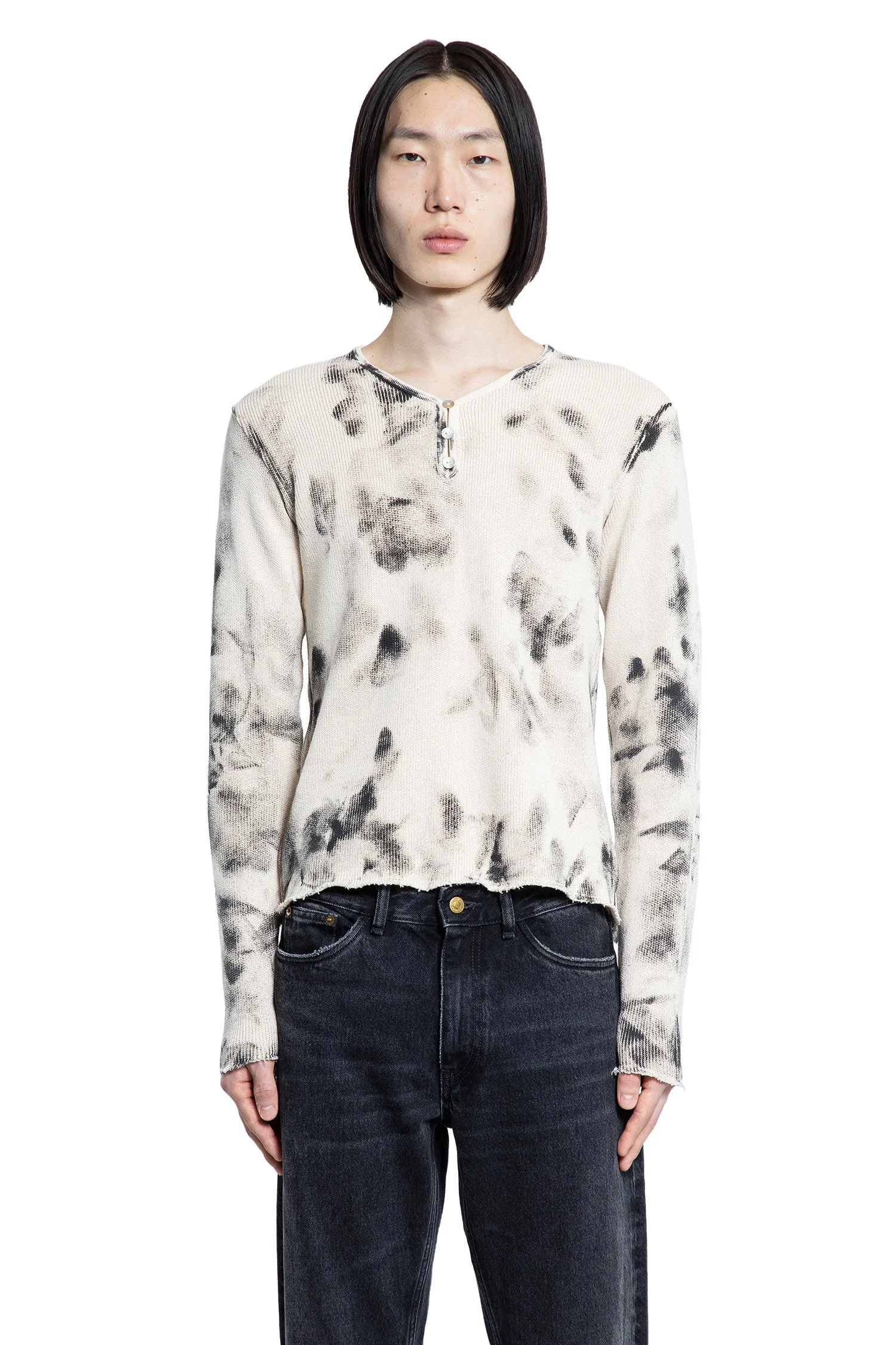 DESCRIPTION - In the Fall Winter 2025 collection, the Ribbed Long Sleeve Tee in black and dirty white merges vintage-inspired texture with modern attitude. Crafted from ribbed cotton knit jersey featuring subtle stain prints, it showcases a V-neck with decorative buttons and a quarter-button closure. The long sleeves, raw-edge hem and cuffs, and waist-length boxy fit create a relaxed, deconstructed silhouette that exudes effortless character. DETAILS - Made in: Portugal - Composition: 100% Cotton - Model code: U1000197 WHITE - Item ID: 9896708538710