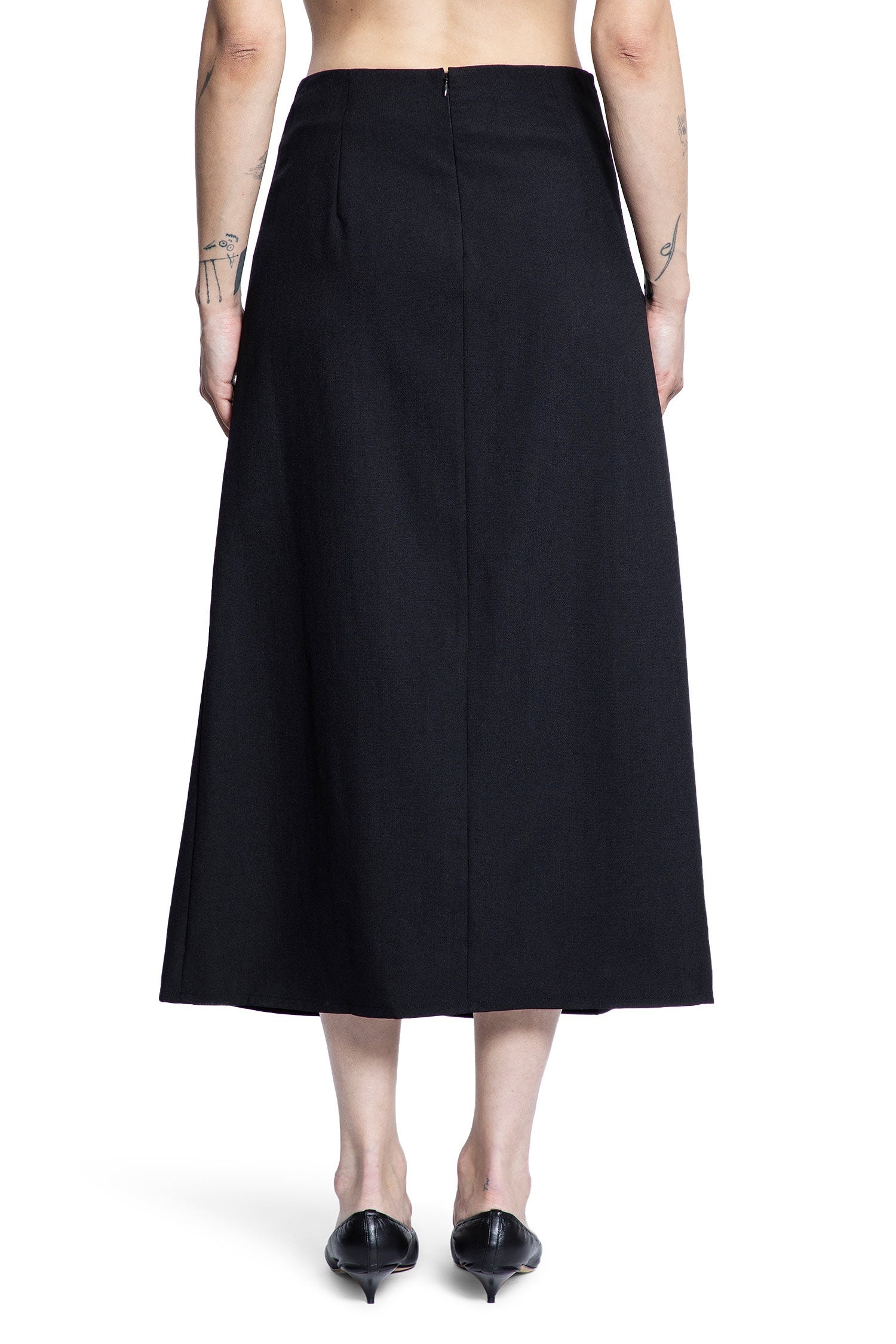 DESCRIPTION - Black - Stretch wool twill - High-waisted - Pleated front - Back zip closure - Flared cut DETAILS - Made in: Italy - Composition: 94% Virgin Wool 6% Polyamide - Model code: FUSESNW1597 BLACK - Item ID: 9398869590358 SIZE & FIT Model wears size 38 Model Height 175 cm Bust 82 cm Waist 68 cm Hips 93 cm