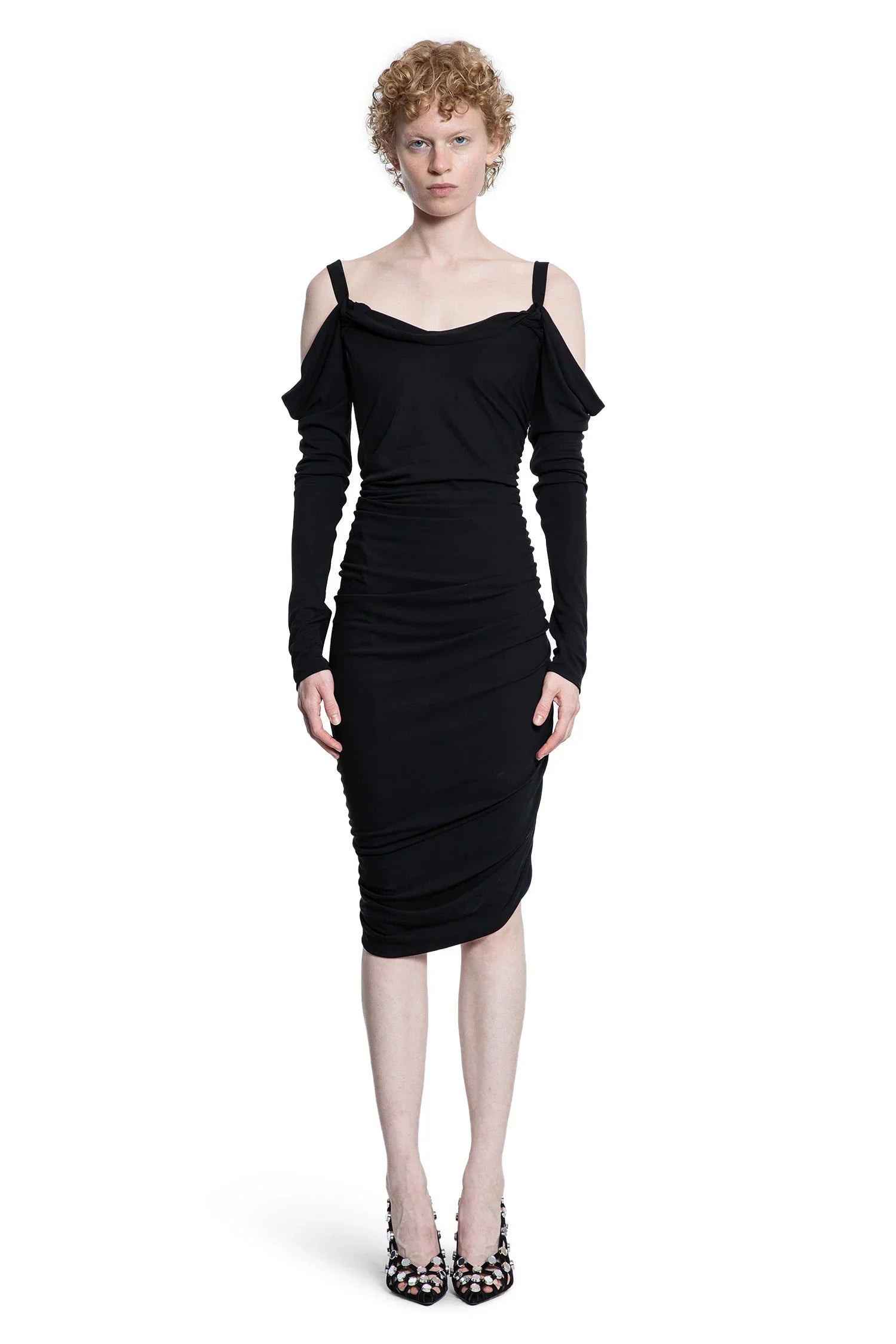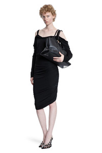 DESCRIPTION - Black - Crepe Viscose - Ruched - Knotted shoulder straps - Long draped sleeves - Cut-out shoulders - Back embroidered logo - Asymmetric ruched back - Asymmetric hem - Fitted DETAILS - Made in: Italy - Composition: 100% Viscose - Model code: 251WCW00248VVV105AA 100 - Item ID: 9650908201302 SIZE & FIT Model wears size 38 Model Height 180 cm Bust 82 cm Waist 58 cm Hips 90 cm