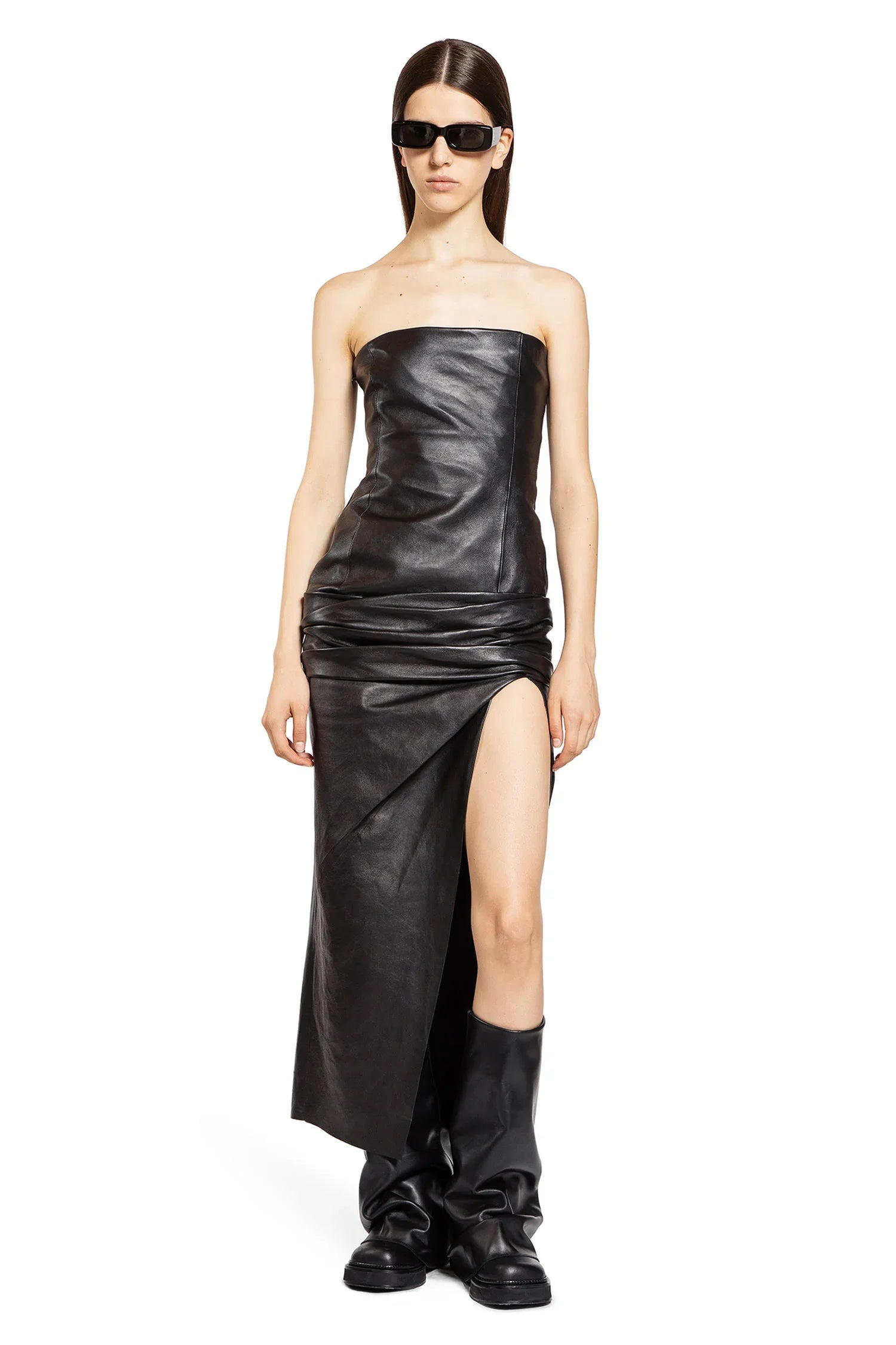 DESCRIPTION - Black - Off-the-shoulders neckline - Sleeveless - Ruched waist - Front split - Darted back - Regular fit DETAILS - Made in: Italy - Composition: 100% Lambskin - Model code: 250WCW00215LBT128AA 100 - Item ID: 9248700760406