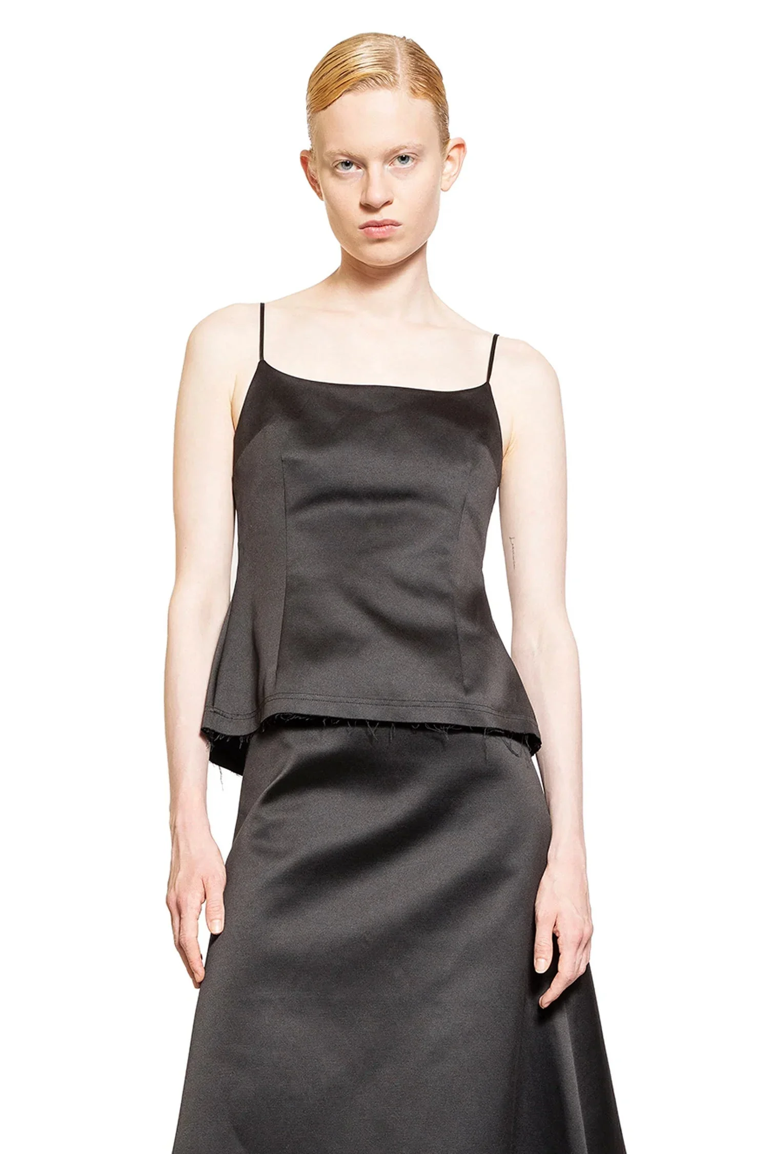 DESCRIPTION - Black - Nylon cotton satin - Square neck - Adjustable shoulder straps - Darted front - Back adjustable hook closure - Cut-out back - Back buttoned panel - Back split DETAILS - Made in: China - Composition: 59% Polyester 41% Cotton - Model code: 20985 050 - Item ID: 9273597985110