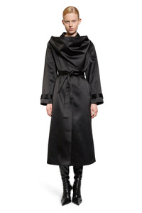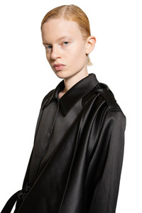 DESCRIPTION - Black - Nylon cotton satin - Collar - Front adjustable and removable draped panel - Epaulettes - Concealed button closure - Side pockets - self-tie belt - Buttoned cuff straps - Back split DETAILS - Made in: China - Composition: 59% Polyester 41% Cotton - Model code: 21115 050 - Item ID: 9273598935382