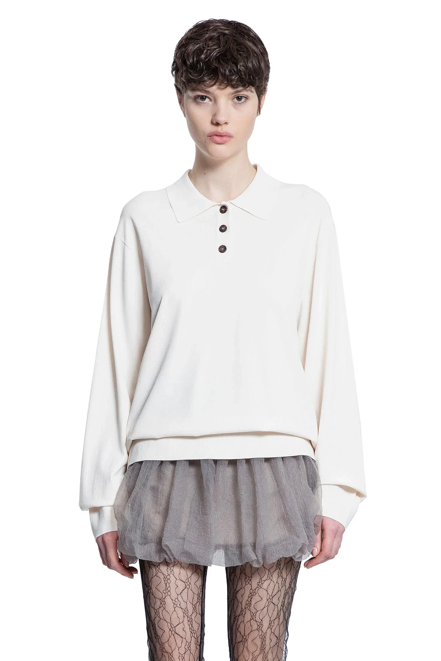 DESCRIPTION - Ecru - Viscose nylon knit - Collar - Quarter-button closure - Front embroidered monogram - Dropped shoulders - Long sleeves - Ribbed hem and cuffs - Oversized fit DETAILS - Made in: China - Composition: 83% Viscose 17% Polyester - Model code: 21109 003 - Item ID: 9273583894870 SIZE & FIT Model wears size 10 Model Height 177 cm Bust 74 cm Waist 61 cm Hips 86 cm