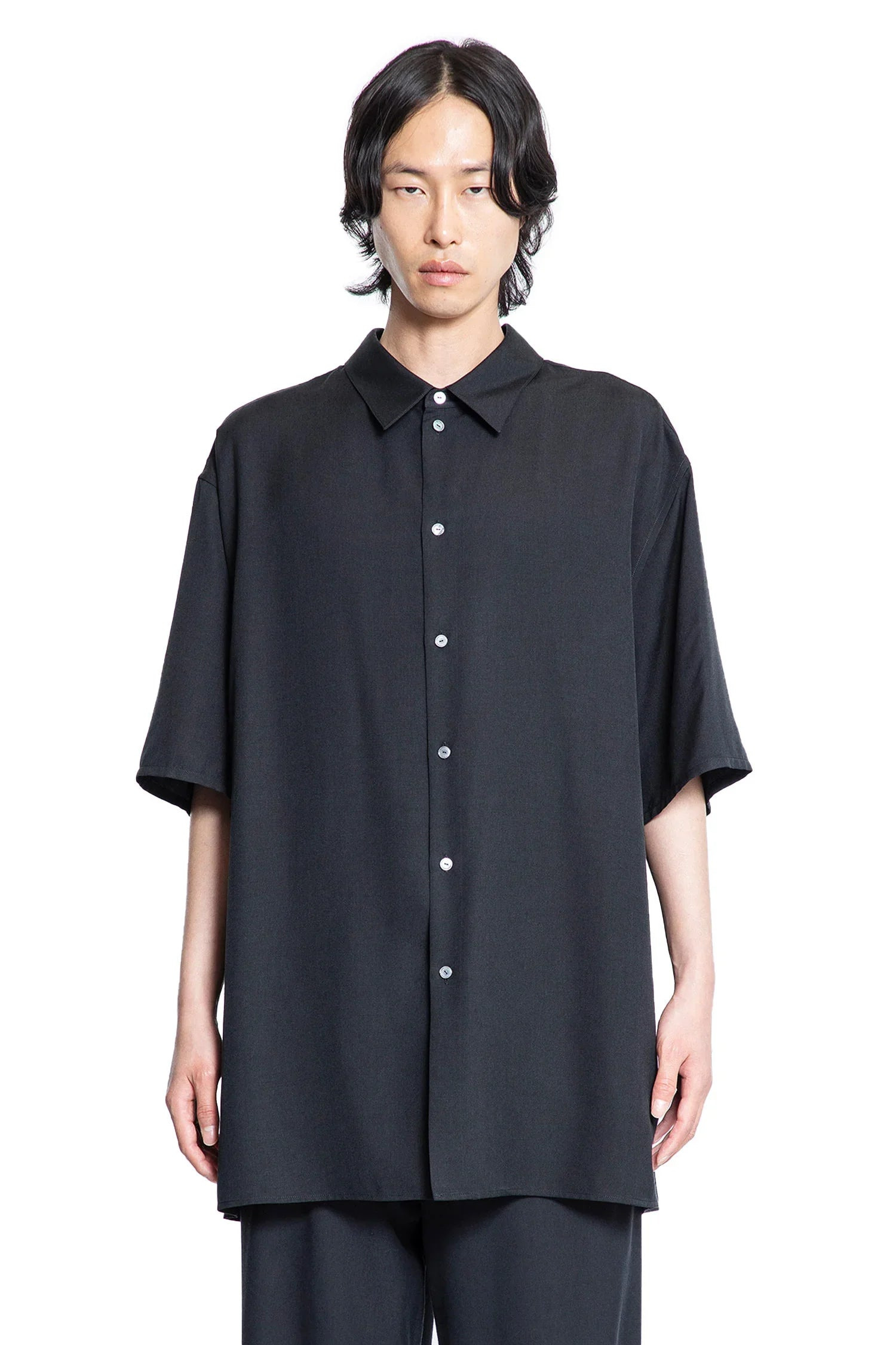 DESCRIPTION - Black - Soft silk and cupro - Classic collar - Button closure - Dropped shoulders - Elbow-length sleeves - Straight hem - Oversized fit DETAILS - Made in: Italy - Composition: 56% Cotton 44% Silk - Model code: 978W3848 BLK - Item ID: 9615960113494 SIZE & FIT Model wears size M Model Height 188 cm Chest 88 cm Waist 69 cm Hips 88 cm
