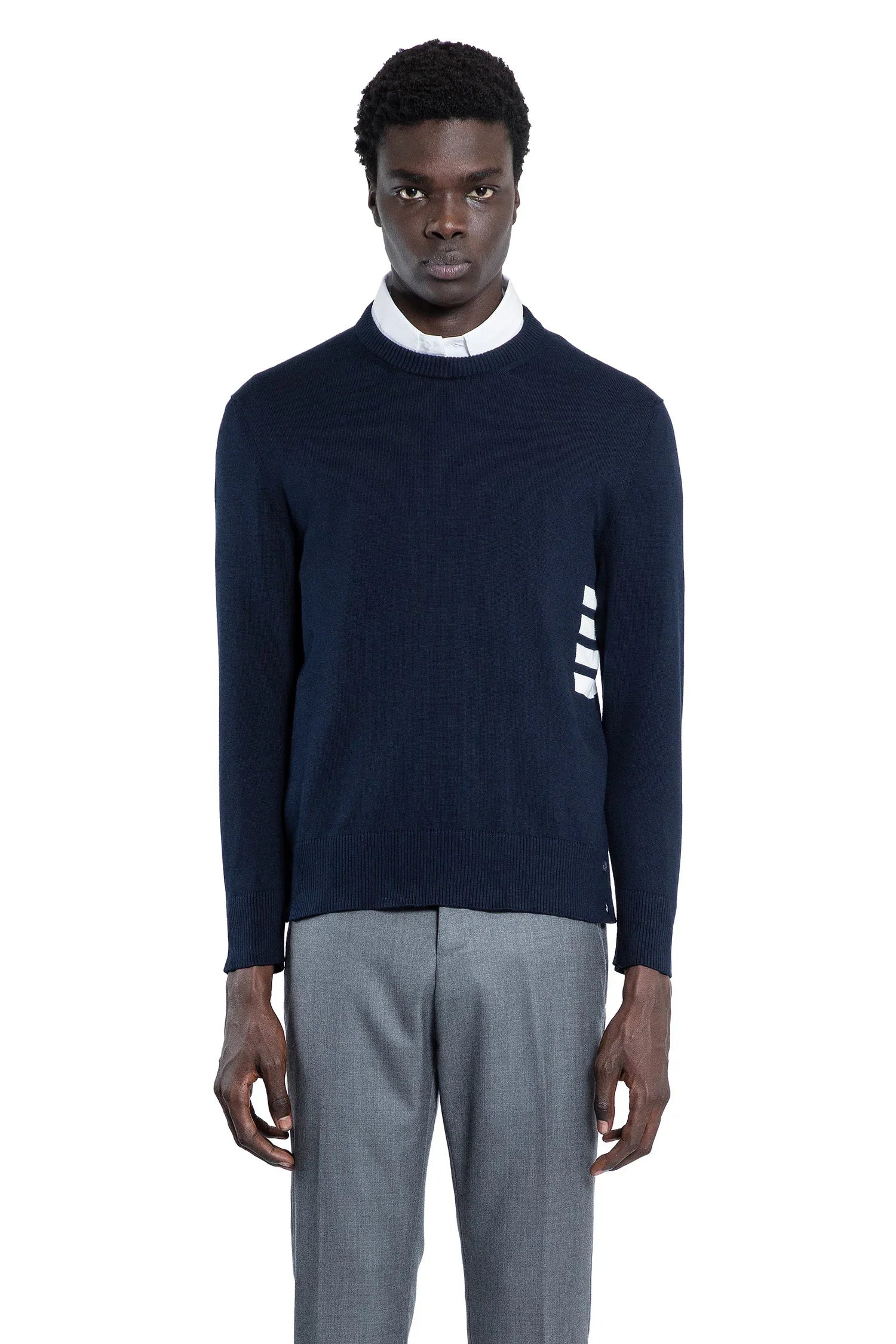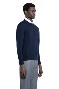 DESCRIPTION - Blue - Cotton knit - Round neck - Side 4 bar stripes intarsia - Long sleeves - Back signature striped loop tab - Ribbed hem and cuffs - Relaxed fit DETAILS - Made in: Italy - Composition: 100% Cotton - Model code: MKA543AY3043 415 - Item ID: 9391948726614 SIZE & FIT Model wears size 2 Model Height 190 cm Chest 87 cm Waist 73 cm Hips 88 cm