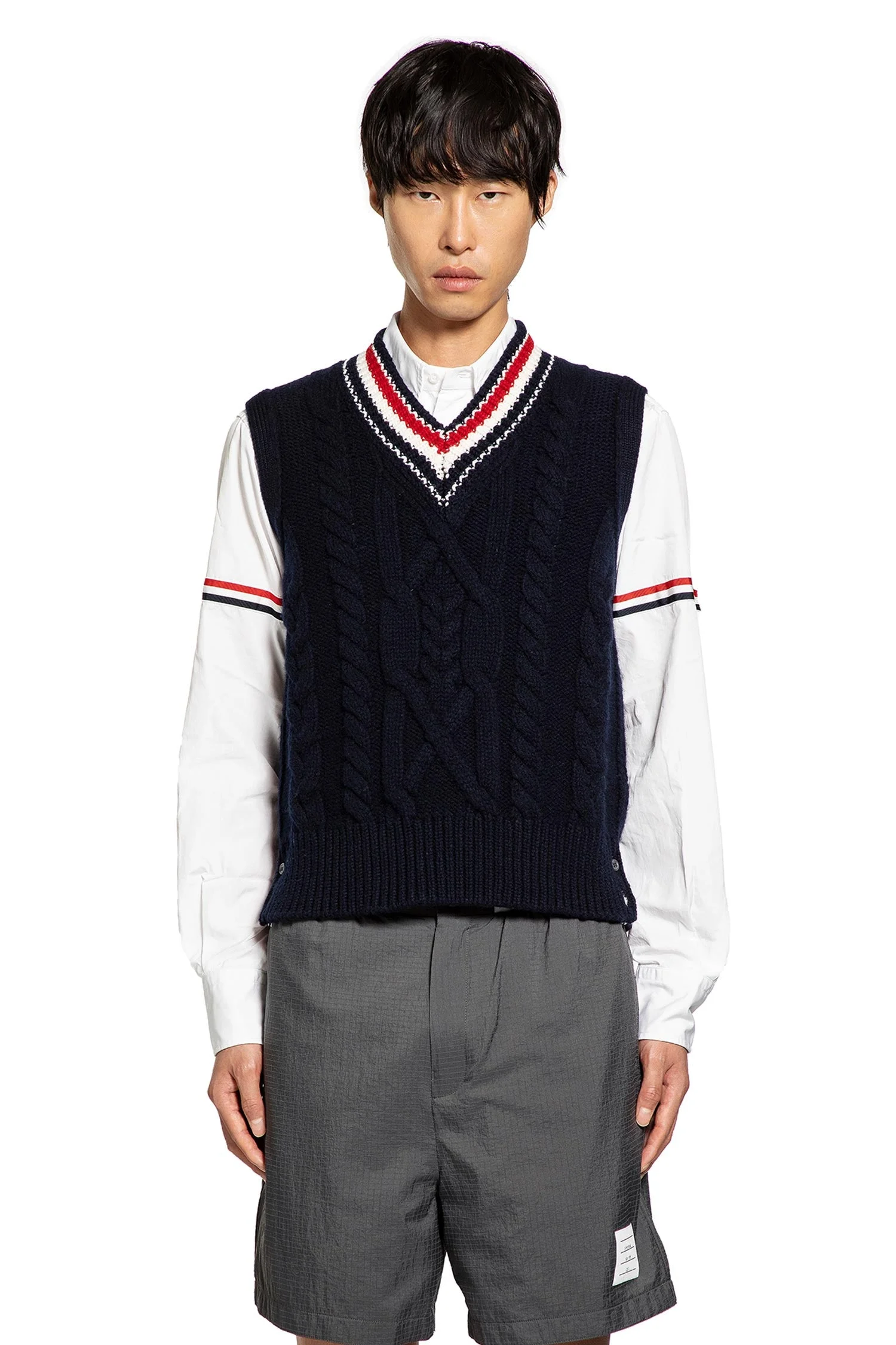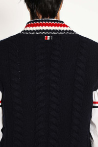 DESCRIPTION - Navy - Aran cable stitch knit - Signature RWB jacquard v-neck - Sleeveless - Buttoned side splits with - Signature grosgrain placket - Back signature grosgrain loop tab - Ribbed hem DETAILS - Made in: Italy - Composition: 98% Wool 2% Elastane - Model code: MKV094AY1005 415 - Item ID: 9837579043158