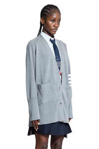 DESCRIPTION - Grey - Cotton jersey stitch knit - V-neck - Button closure with signature grosgrain placket - Side pockets - Raglan sleeves - Sleeve 4-bar stripe - Back signature grosgrain loop tab - Ribbed hem and cuffs - Elongated hem - Exagerated loose fit DETAILS - Made in: Italy - Composition: 100% Cotton - Model code: FKC424AY3007 055 - Item ID: 9666114879830 SIZE & FIT Model wears size 40 Model Height 176 cm Bust 77 cm Waist 60 cm Hips 87 cm