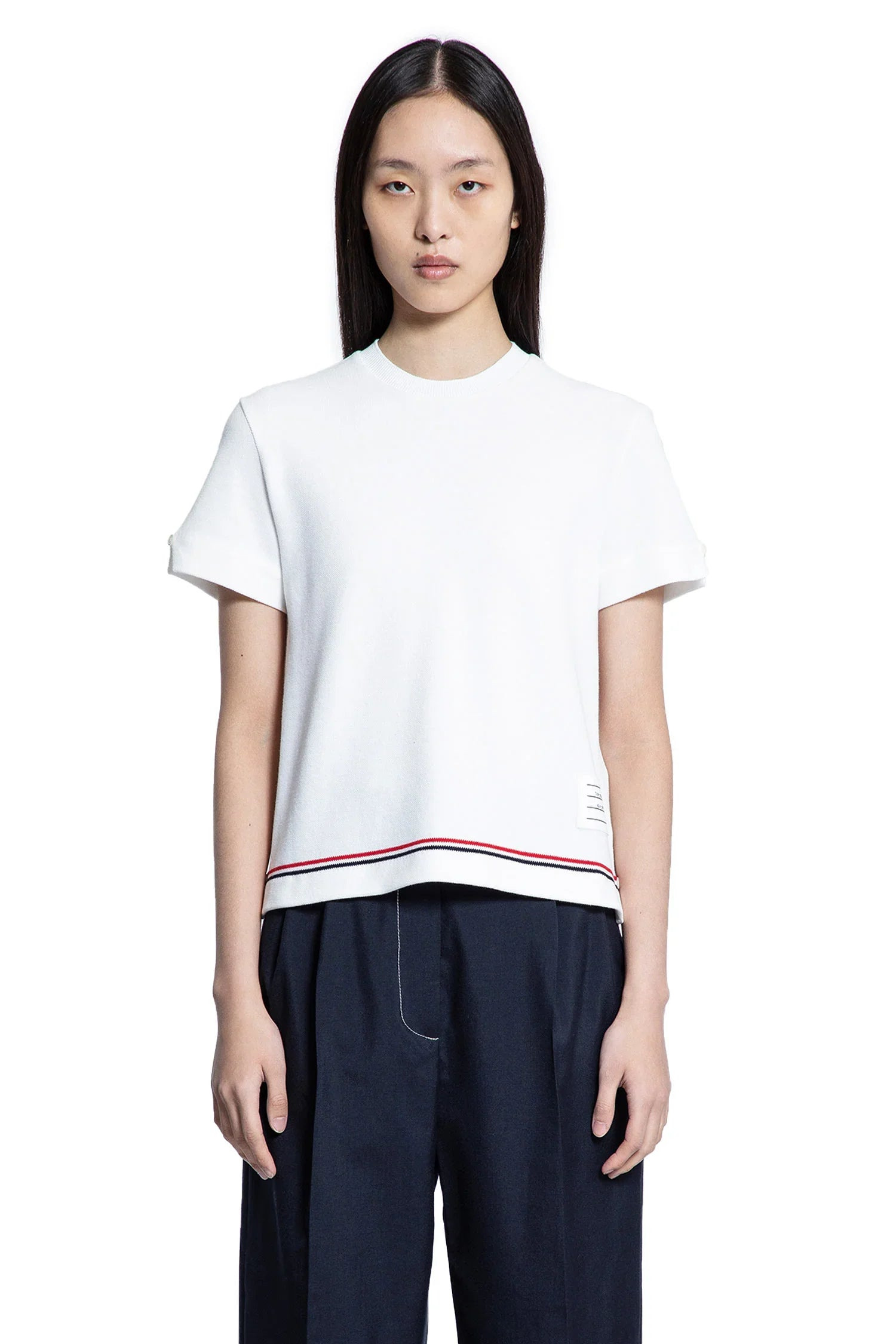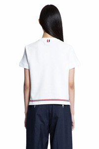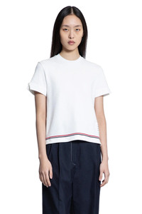 DESCRIPTION - White - Cotton pique - Round neck - Signature striped trim - Dropped shoulders - Notched buttoned short sleeves - Front name tag applique - Back signature striped grosgrain loop tab - Relaxed fit DETAILS - Made in: Italy - Composition: 95% Cotton 5% Elastane - Model code: FJS193AJ0185 100 - Item ID: 9502204789078 SIZE & FIT Model wears size 40 Model Height 177 cm Bust 76 cm Waist 63cm Hips 89 cm