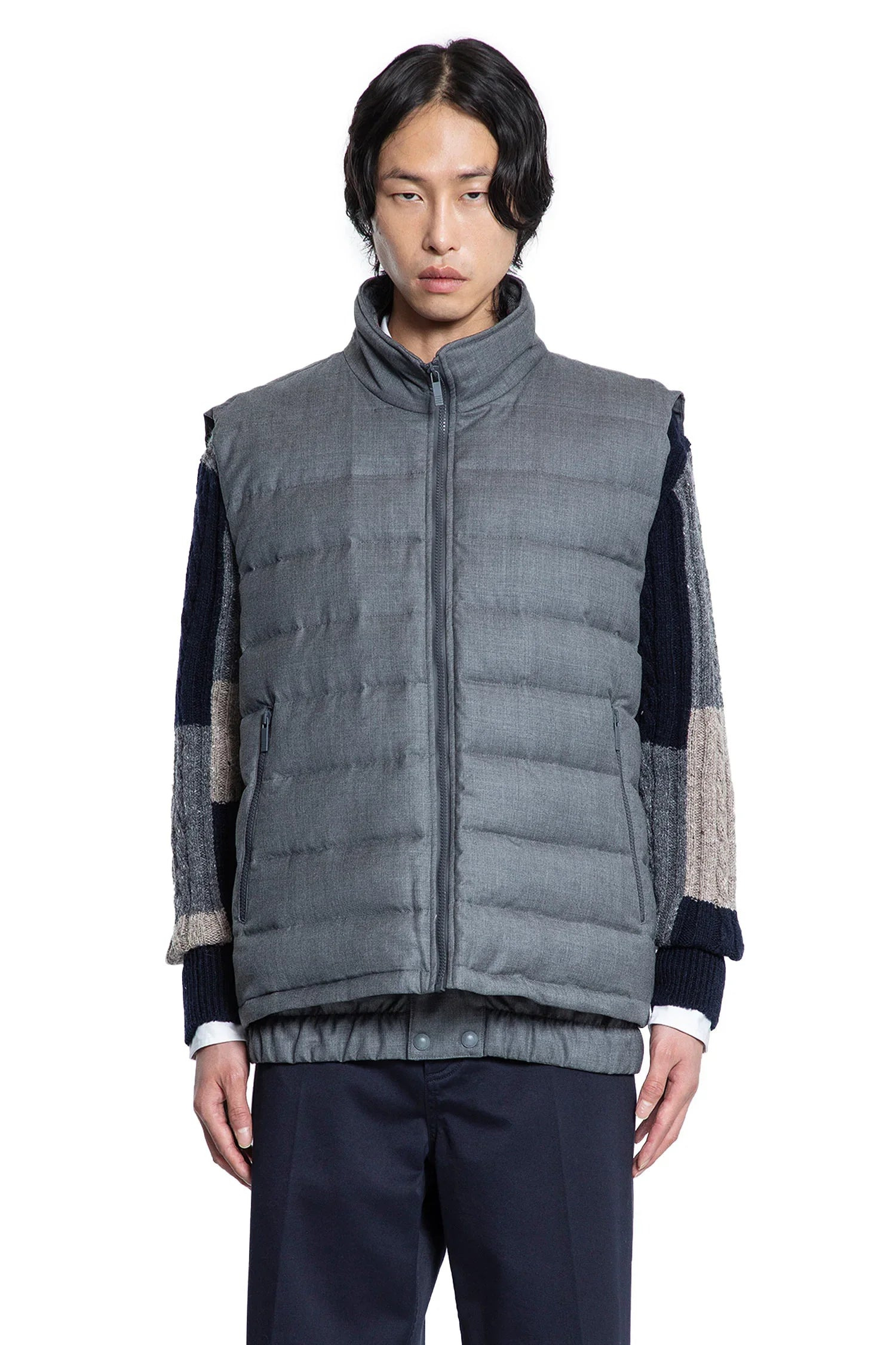 DESCRIPTION - Medium grey - Padded quilting - Super 120's twill - High-neck - Zip closure - Side zipped pockets - Sleeveless - Back signature grosgrain loop tab - Regular fit DETAILS - Made in: Italy - Composition: 100% Wool Padding: 100% Polyester - Model code: MVD021X00626 035 - Item ID: 9636175642966 SIZE & FIT Model wears size 3 Model Height 188 cm Chest 88 cm Waist 69 cm Hips 86 cm