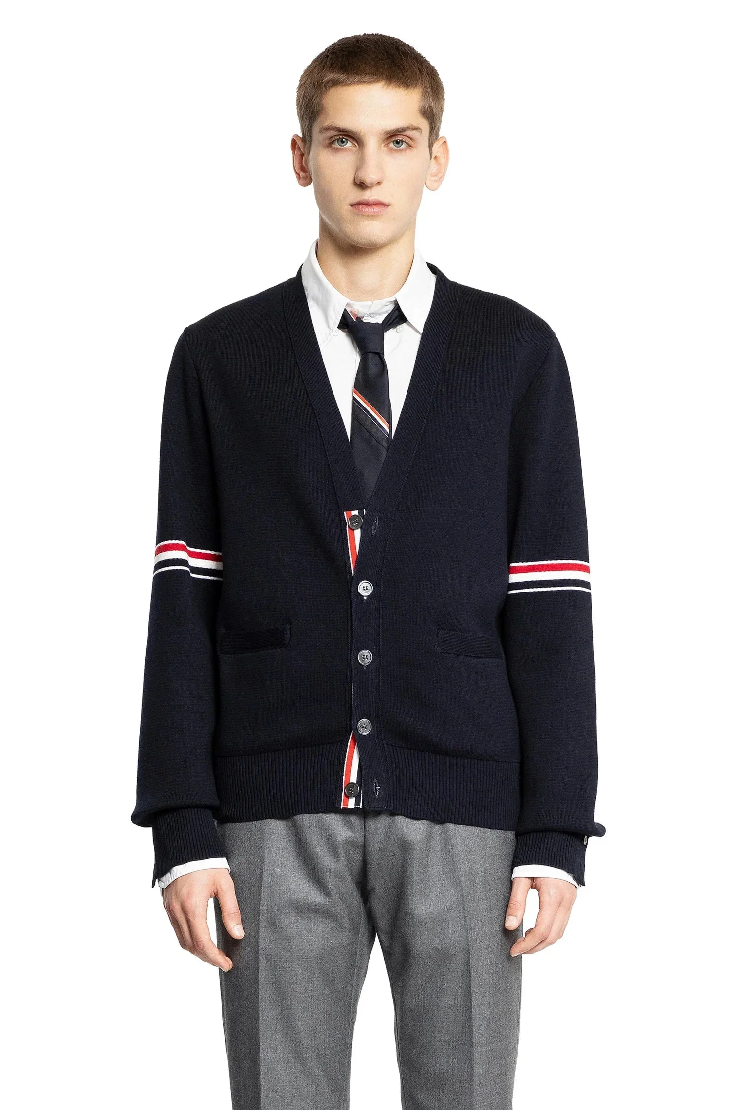- Navy - V-neck - milano stitch cotton knit - Button closure - Dropped shoulders - Sleeve 4-bar stripe jacquard - Buttoned side splits with signature grosgrain loop tab - Buttoned cuffs with signature grosgrain loop tab - Back signature grosgrain loop tab - Ribbed hem and cuffs DETAILS - Made in: Italy - Composition: 100% Cotton - Model Code: MKC310AY3007 415 - Item ID: 8583080182102 SIZE & FIT Model wears size III Model Height 187 cm Chest 90 cm Waist 70 cm Hips 92 cm