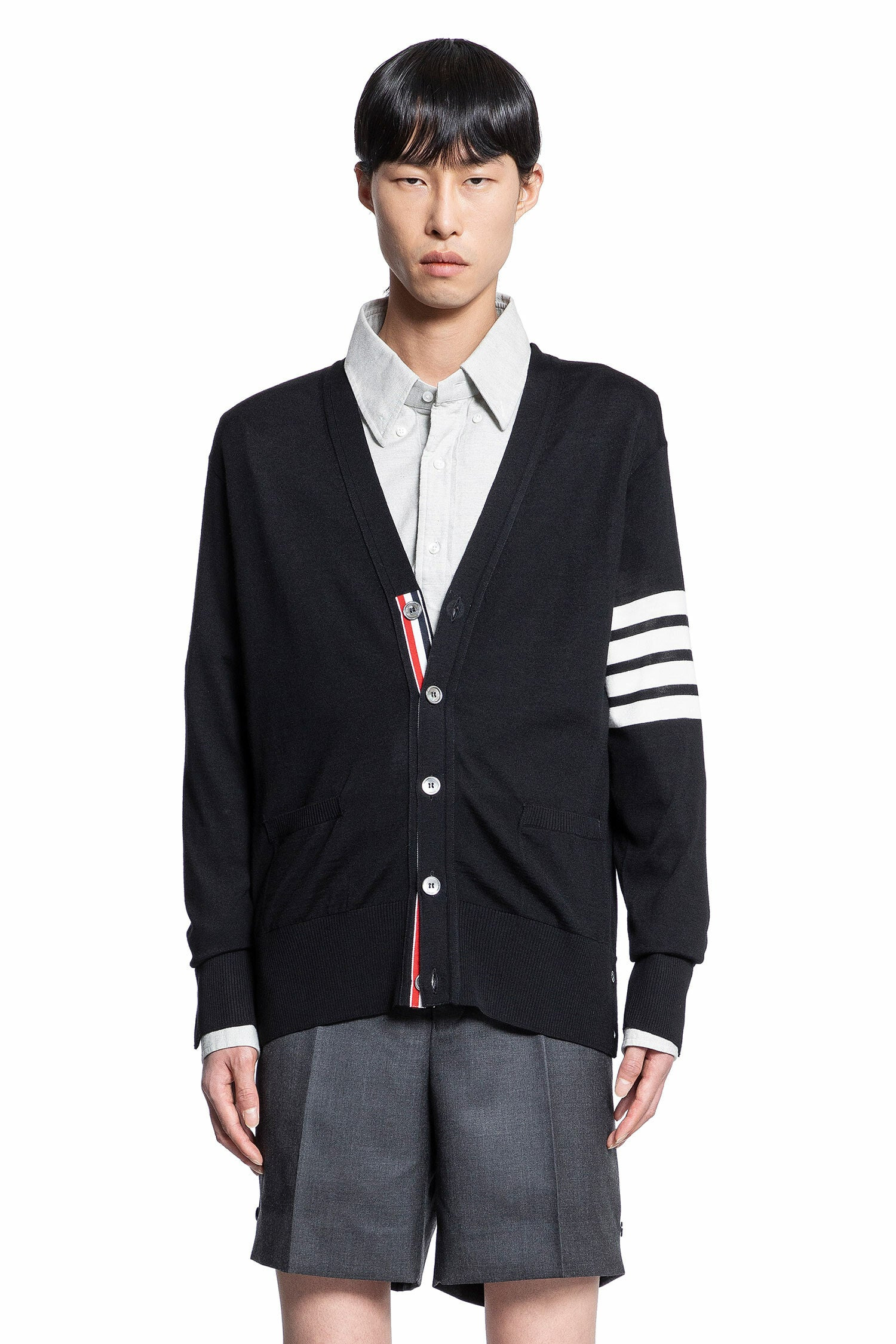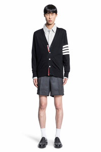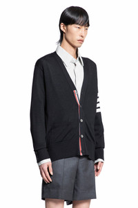 DESCRIPTION - Black - V-neck - Button closure with signature grosgrain placket - Front pockets - Sleeve 4-bar stripe - Buttoned cuffs with signature grosgrain placket - Ribbed hem and cuffs - Back signature grosgrain placket DETAILS - Made in: Italy - Composition: 100% Virgin Wool - Model code: MKC002AY1014 001 - Item ID: 8837576786262 SIZE & FIT Model wears size III Model Height 188 cm Chest 88 cm Waist 69 cm Hips 88 cm