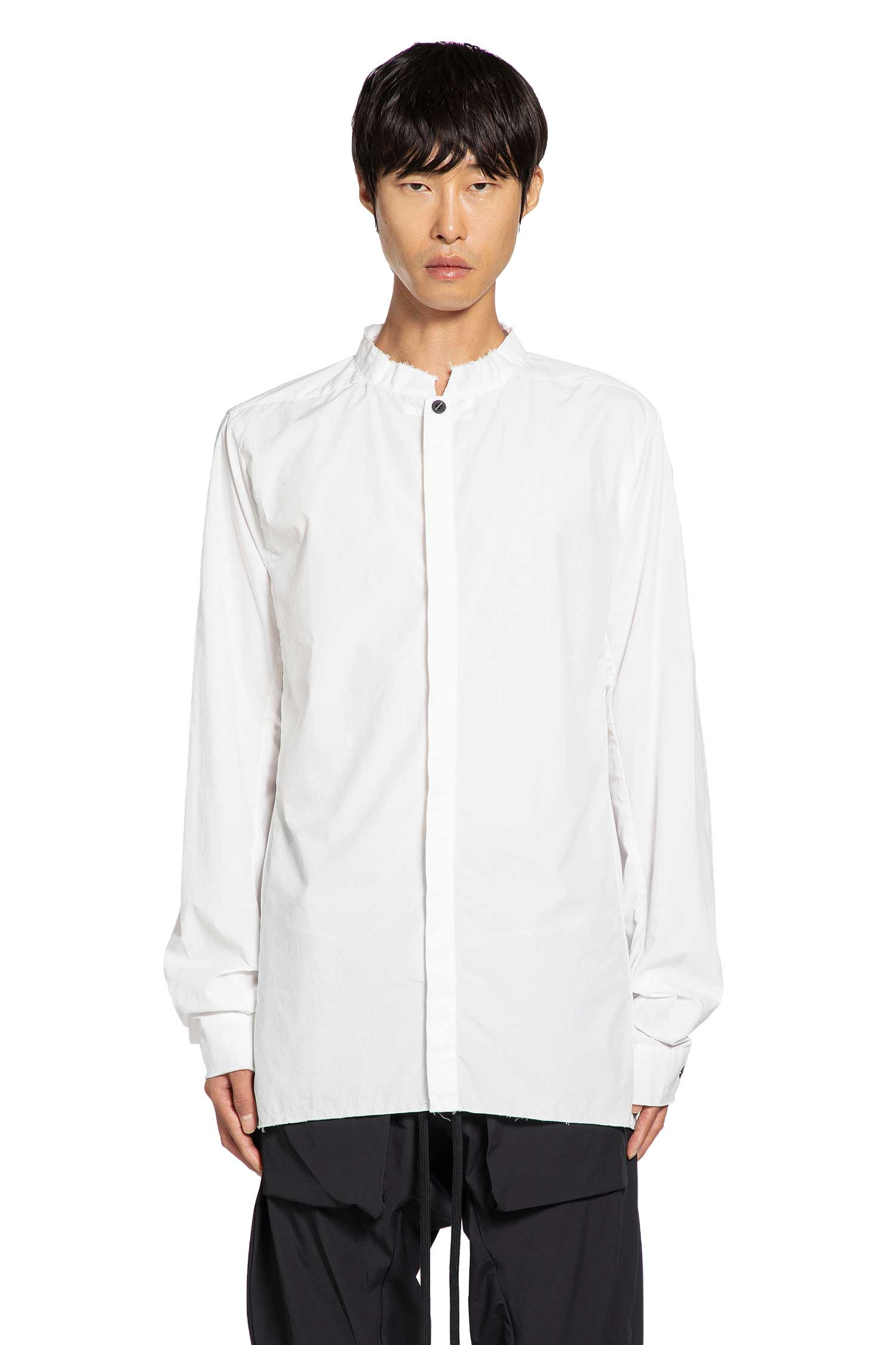 DESCRIPTION - White - Cotton Poplin - raw-edge Stand Collar - Concealed button closure - Dropped shoulders - Long sleeves - Buttoned cuffs - Straight hem DETAILS - Made in: Portugal - Composition: 100% Cotton - Model code: MH177 WHITE - Item ID: 9793451032918 SIZE & FIT Model wears size S Model Height 188 cm Chest 88 cm Waist 69 cm Hips 88 cm