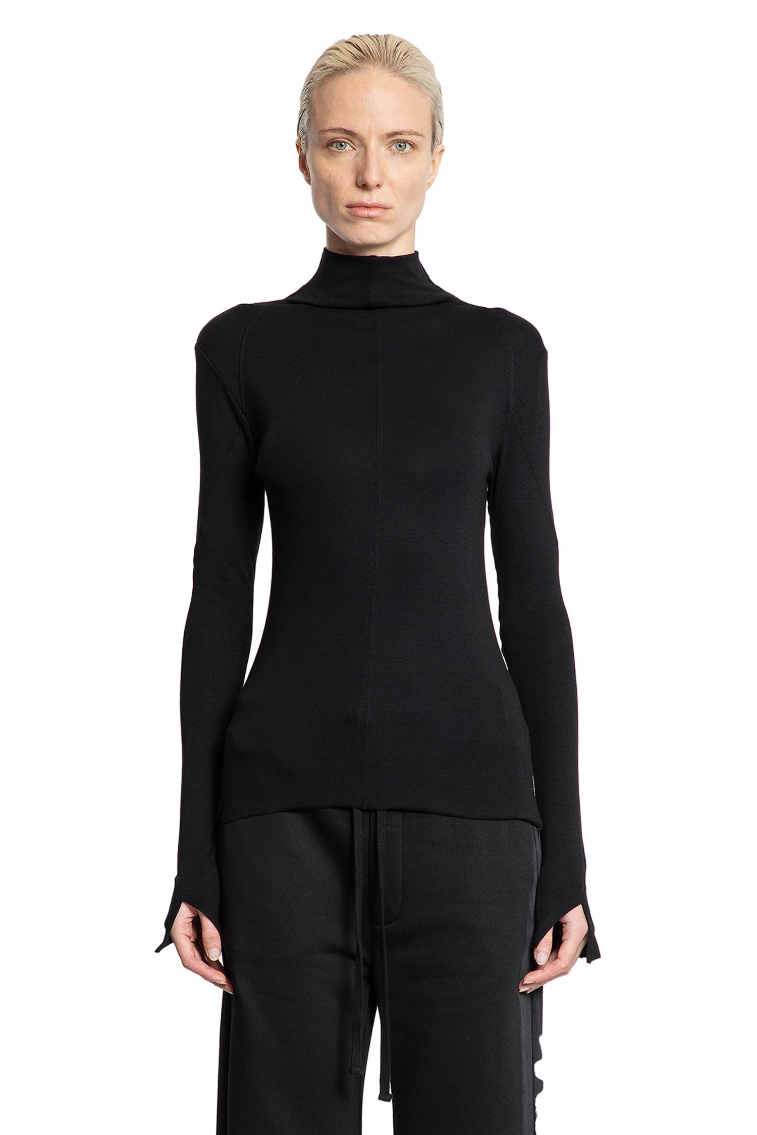 DESCRIPTION - Black - Lightweight stretch viscose jersey - Turtleneck - Signature crossed seams - Dropped shoulders - Long sleeves - Cuff splits - Back signature graphic embroidery - Raw-edge hem and cuffs - Fitted DETAILS - Made in: Turkey - Composition: 95% Viscose 5% Elastane - Model code: WTS589 BLACK - Item ID: 9720457429334 SIZE & FIT Model wears size S Model Height 180 cm Bust 80 cm Waist 59 cm Hips 89 cm