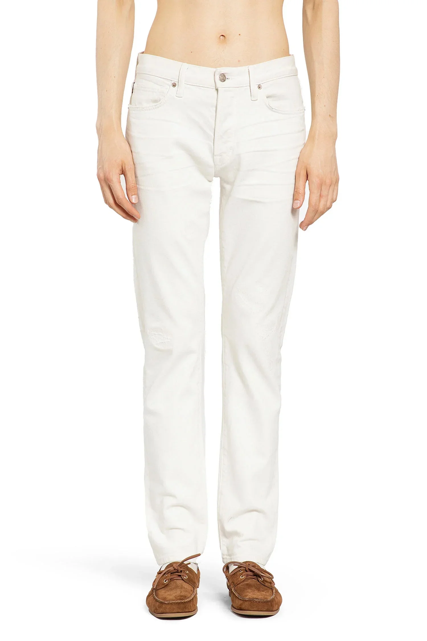 DESCRIPTION - Ivory - Washed denim - Distressed details - Belt holes - Button closure - 5 pockets - Back leather logo patch - Straight leg DETAILS - Made in: Italy - Composition: 100% Cotton - Model code: DPH001DMC059S25 AW008 - Item ID: 9273432113494
