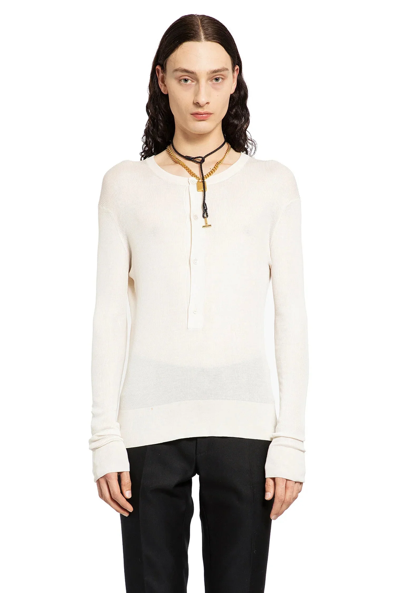 DESCRIPTION - Ivory - Semi-sheer viscose nylon knit - Round neck - Half-button closure - Dropped shoulders - Ribbed hem and cufs - Slim fit DETAILS - Made in: Italy - Composition: 50% Silk 50% Viscose - Model code: KYL023YMS081F24 AW004 - Item ID: 9273434603862