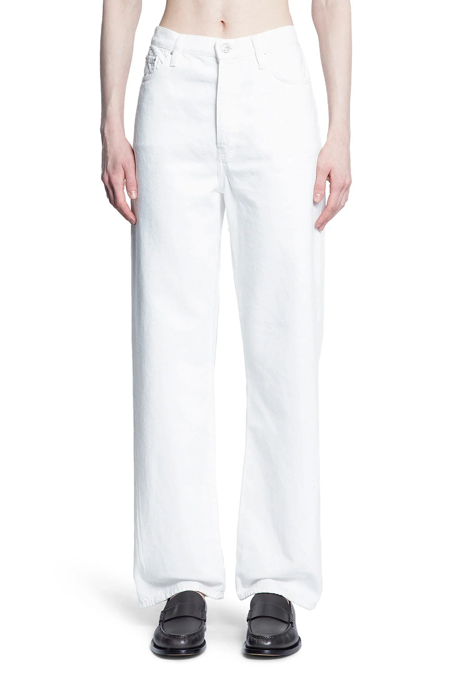 DESCRIPTION - White - Washed rigid denim - Twisted seams - Low to mid-waist - Belt holes - Button closure - 5 pockets - Elongated straight leg - Relaxed fit DETAILS - Made in: Italy - Composition: 100% Cotton - Model code: 23124074832 110 - Item ID: 9302342369622 SIZE & FIT Model wears size 28 Model Height 180 cm Bust 82 cm Waist 58 cm Hips 90 cm