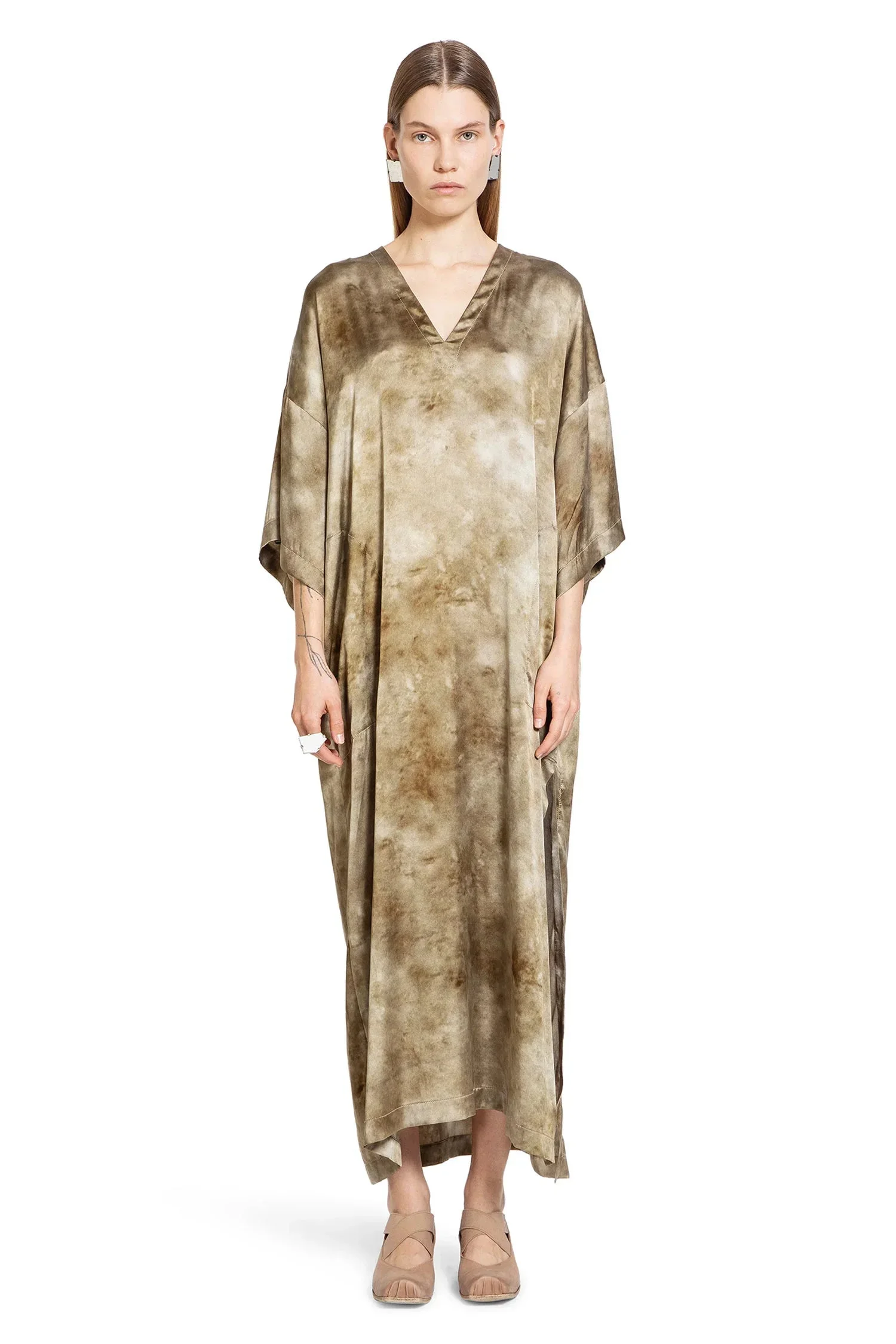 DESCRIPTION - Multicolor - Grey/green - V-neck - Dropped shoulders - Side pockets - Three-quarter length sleeves - Back siganture stitching - Loose fit DETAILS - Made in: Italy - Composition: 94% Silk 6% Elastane - Model code: UW5011 UW840 - Item ID: 9404230402390