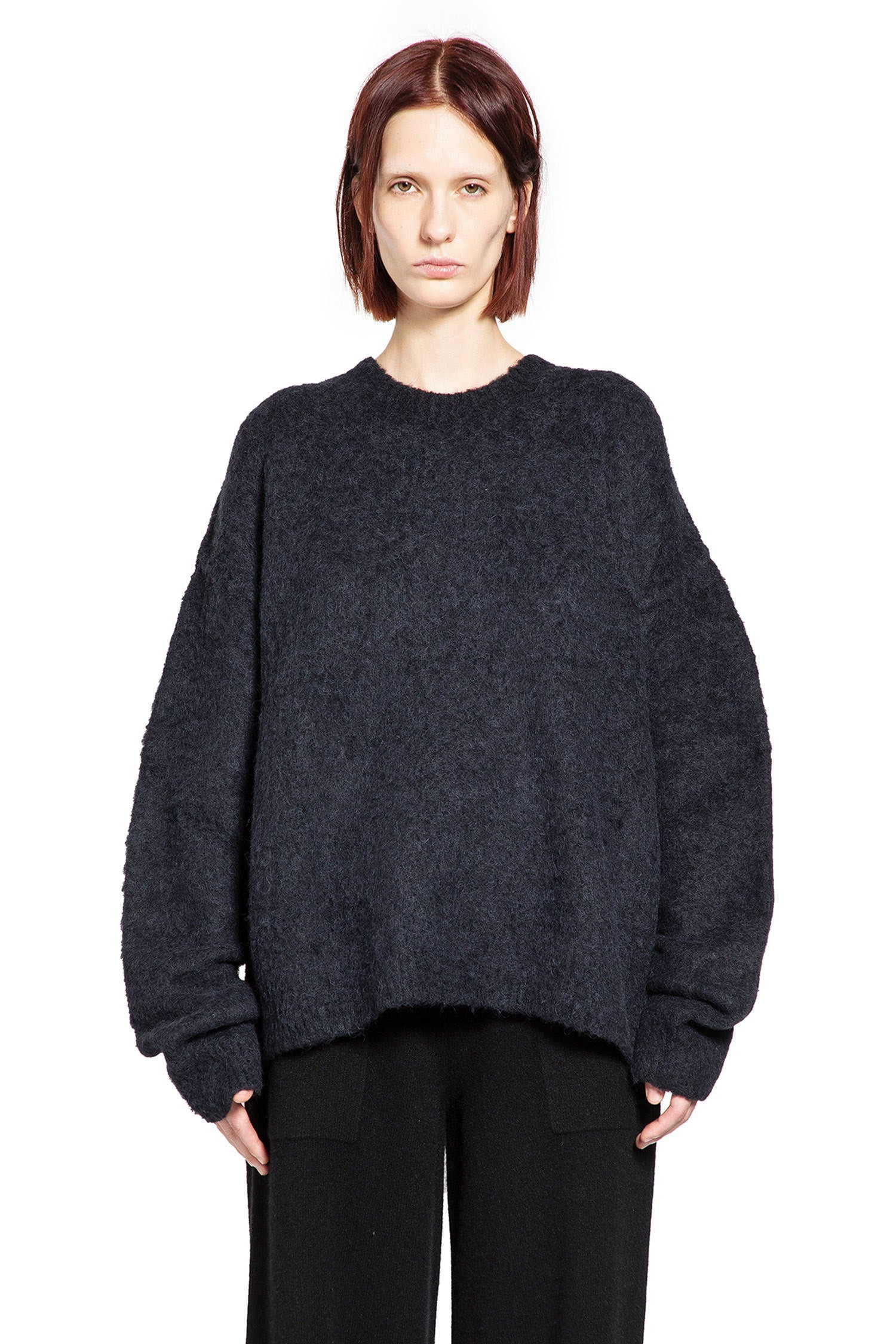 DESCRIPTION - Black - Heavyweight felted alpaca wool knit - Crewneck - Dropped shoulders - Back signature stitching - Ribbed hem and cuffs - Oversized fit DETAILS - Made in: Italy - Composition: 51% Alpaca 28% Virgin Wool 18% Polyamide 3% Elastane - Model code: UK7172 UW900 - Item ID: 9765180506454