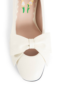 DESCRIPTION - Ivory - Smooth leather - Front leather bow - Square toe - Gold-metal vlogo plaque - Leather covered kitten heel - Leather sole DETAILS - Made in: Italy - Composition: 100% Kidskin - Model code: 6W2S0LB5DDT 098 - Item ID: 9465010848086