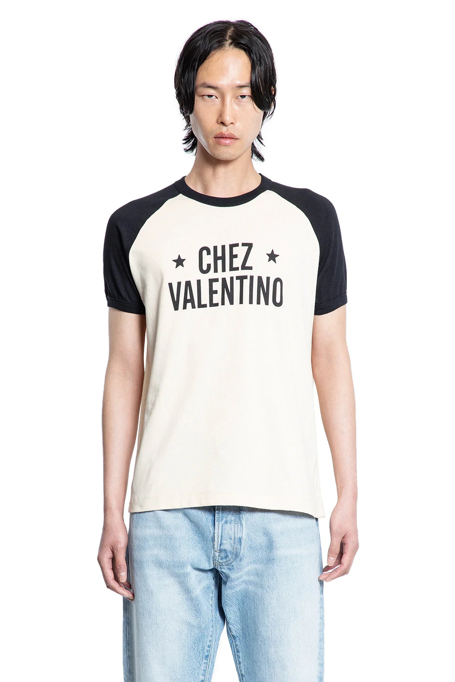 DESCRIPTION - Black and white - Cotton jersey - Round neck - Front chez valentino print - Contrasting raglan sleeves - Regular fit DETAILS - Made in: Italy - Composition: 100% Cotton - Model code: 7V3MG17DAYC QT3 - Item ID: 9621931524438 SIZE & FIT Model wears size S Model Height 188 cm Chest 88 cm Waist 69 cm Hips 88 cm