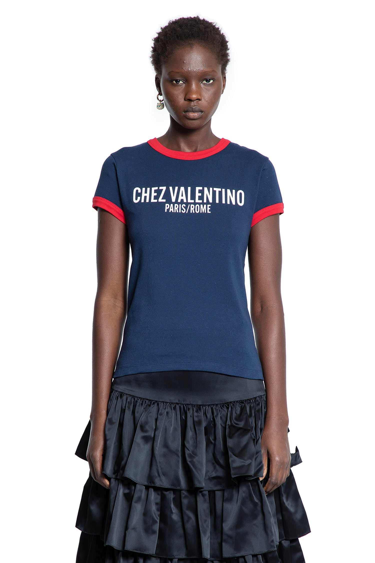 DESCRIPTION - Multicolor - Blue/red - Cotton jersey - Round neck - Front chez valentino print - Short sleeves - Slim fit DETAILS - Made in: Italy - Composition: 100% Cotton - Model code: 7B3MG24D970 BN4 - Item ID: 9700190486870 SIZE & FIT Model wears size S Model Height 180 cm Bust 77 cm Waist 57 cm Hips 87 cm