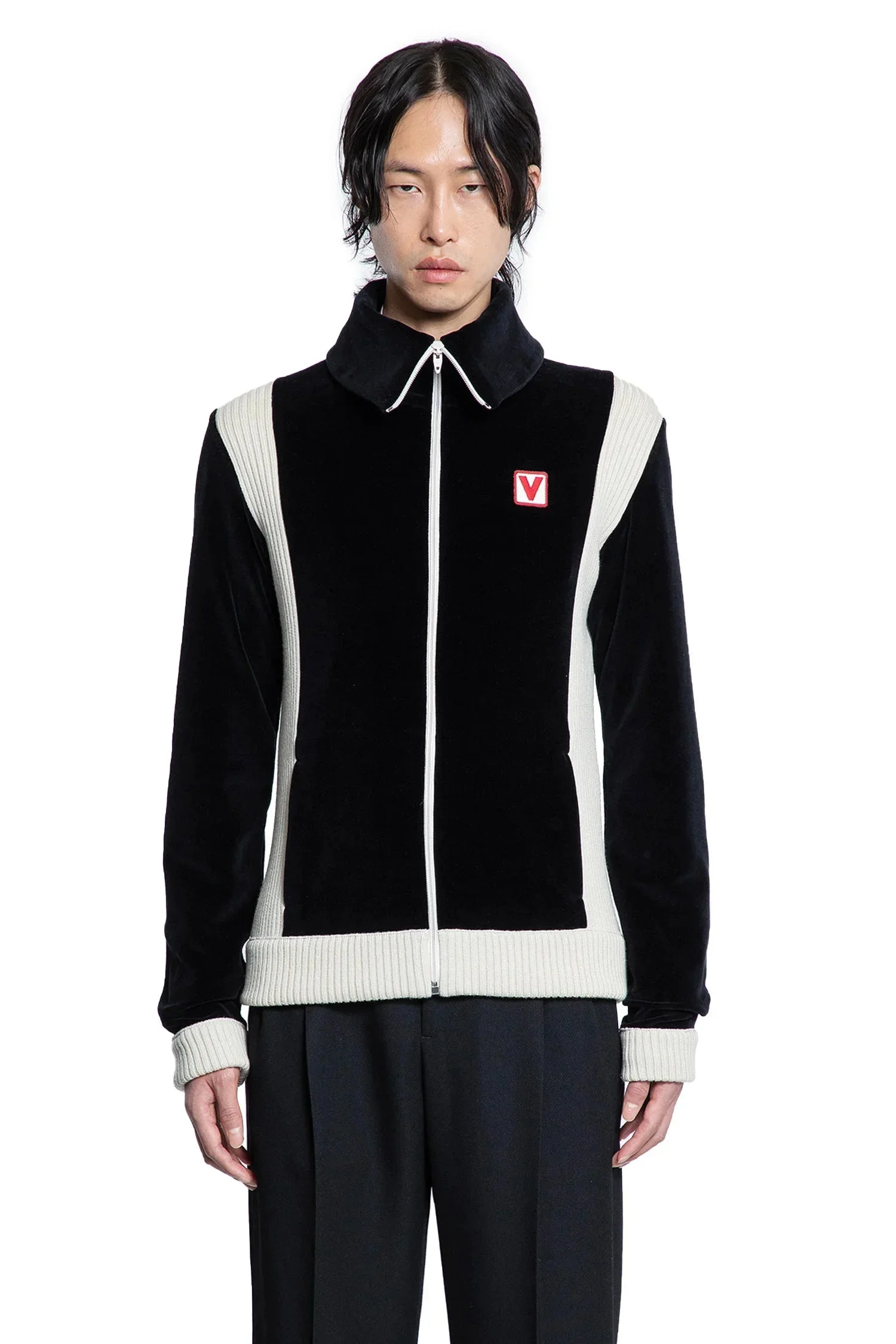 DESCRIPTION - Black and white - Chenille and ribbed-knit - High-neck - Zip closure - Chest embroidered chez valentino patch - Side pockets - Dropped shoulders - Ribbed hem and cuffs - Regular fit DETAILS - Made in: Italy - Composition: 85% Cotton 15% Polyamide - Model code: 6V3MF28VARA 0NO - Item ID: 9349248647510 SIZE & FIT Model wears size M Model Height 187 cm Chest 90 cm Waist 73 cm Hips 92 cm
