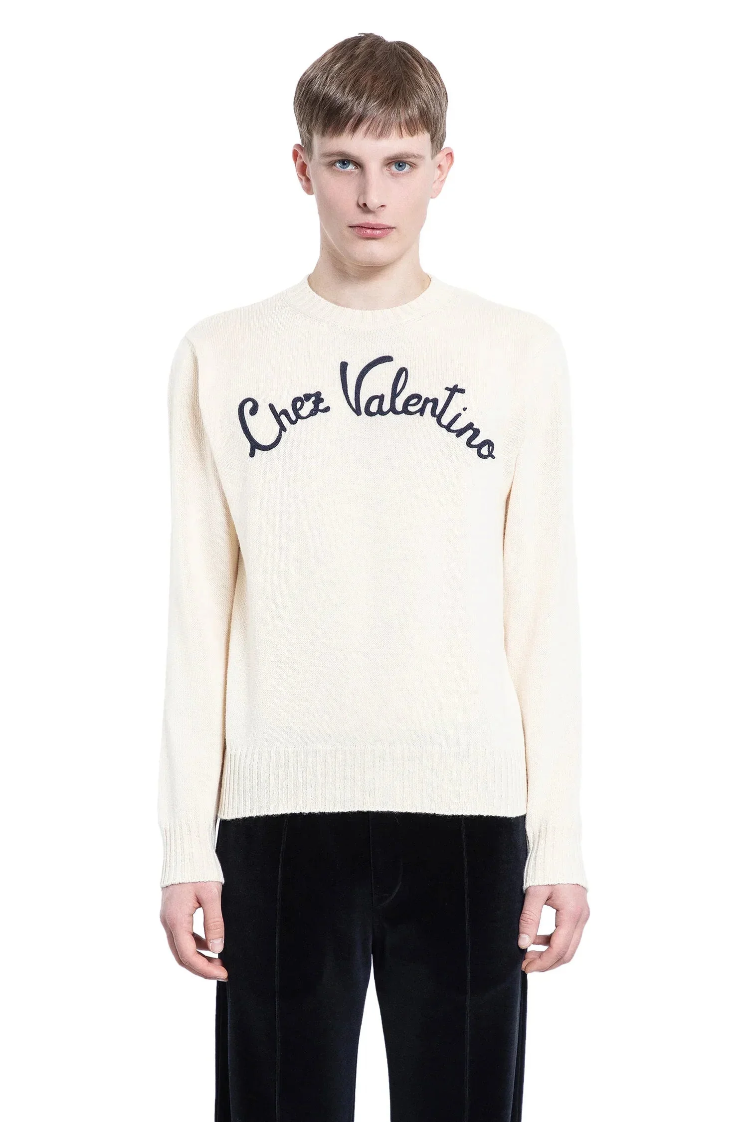 DESCRIPTION - Butter - Crewneck - Front chez valentino jacquard - Dropped shoulders - Ribbed hem and cuffs - Regular fit DETAILS - Made in: Italy - Composition: 100% Virgin Wool - Model code: 6V3KC33LAR8 581 - Item ID: 9349247533398 SIZE & FIT Model wears size M Model Height 187 cm Chest 90 cm Waist 73 cm Hips 92 cm
