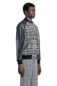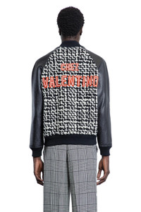 DESCRIPTION - Black and ivory - Wool tweed and grained leather - Lightly padded - Ribbed collar - Zip closure - Side pockets - Back Embroidered Chez Valentino patch - Ribbed hem and cuffs - Regular fit DETAILS - Made in: Italy - Composition: 98% Virgin Wool 2% polyamide Sleeves: 100% Bovine Leather Padding: 100% Polyester - Model code: 6V3CIM21AMA 0AN - Item ID: 9349976916310 SIZE & FIT Model wears size 48 Model Height 187 cm Chest 90 cm Waist 73 cm Hips 92 cm