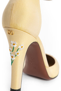 DESCRIPTION - Ochre - Silk shantung canvas - Floral graphic Embroideries - Buckled ankle strap - Back antique brass Vlogo plaque - Block heel DETAILS - Made in: Italy - Composition: 100% Silk 100% Goatskin - Model code: 7W2S0MI2ZBN JB5 - Item ID: 9700281418070