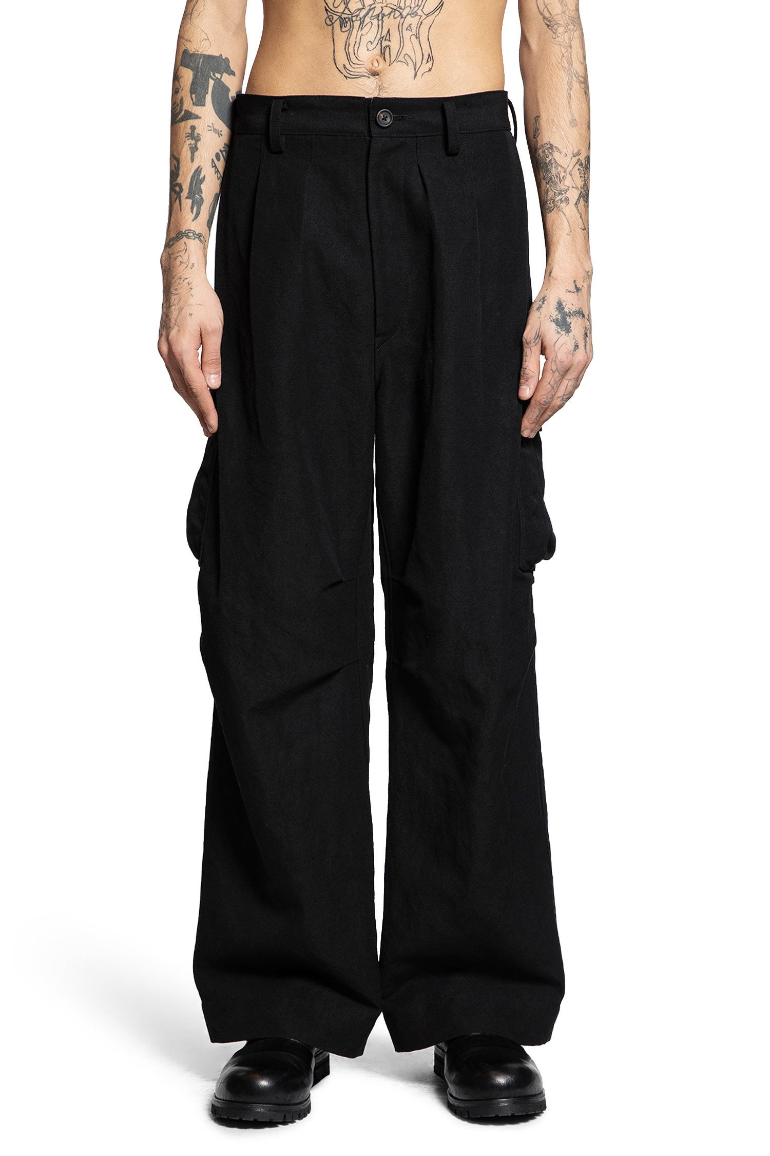 DESCRIPTION - Black - Wool linen cashmere felt - Belt holes - Front pleats - Side pockets - Slouched knees - Cargo pockets - Back buttoned waist tabs - Back button flap pockets - Wide leg DETAILS - Made in: China - Composition: 52% Wool 24% Linen 24% Cashmere - Model code: 0M2530510 04 - Item ID: 9860434559318