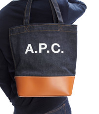 A.P.C. tote bag. - Tote bag in Japanese denim. - Two large handles. May be carried on shoulder or by hand. - Wide band in smooth leather on bottom of bag. - Reinforced base. - Interior zip pocket. - Large A.P.C. logo in front. - Caramel topstitching on the denim. - Small version of the Axelle tote bag. Size Advice - Dimensions: 8.6 x 12 x 4.7. Composition & Material - 98% cotton. 2% polyurethane. - 100% leather. - Made in Mauritius. Our commitments Through its RESPECT program A.P.C reduces (by implementing many practical measures to improve its environmental footprint) regulates (by respecting and enforcing its ethical responsibility on the part of its employees as well as its suppliers) and reuses (through its recycling vintage or quilts and butler programs for example).