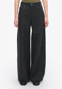 - Soft and structured material. - High rise. - Long wide leg. - Hip-hugging. - Guitar and dagger buttons. - Tone-on-tone topstitching. Composition & Material - 100% wool. - Portuguese material. - Made in Bugaria. - Hand wash or delicate cycle.