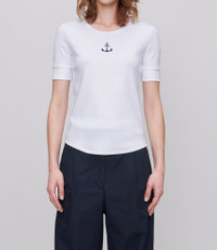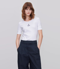 - Slightly ribbed material. - Fitted cut. - Wide neckline. - Anchor embroidered in the centre. - 95% organic cotton. Size Advice - Matilda is 5'9 tall and is wearing size S. - This item sizes normally. We recommend that you select your usual size. Composition & Material - 95% cotton. 5% elastane. - Portuguese material. - Made in Portugal. - Machine wash cold (86°F) inside-out.