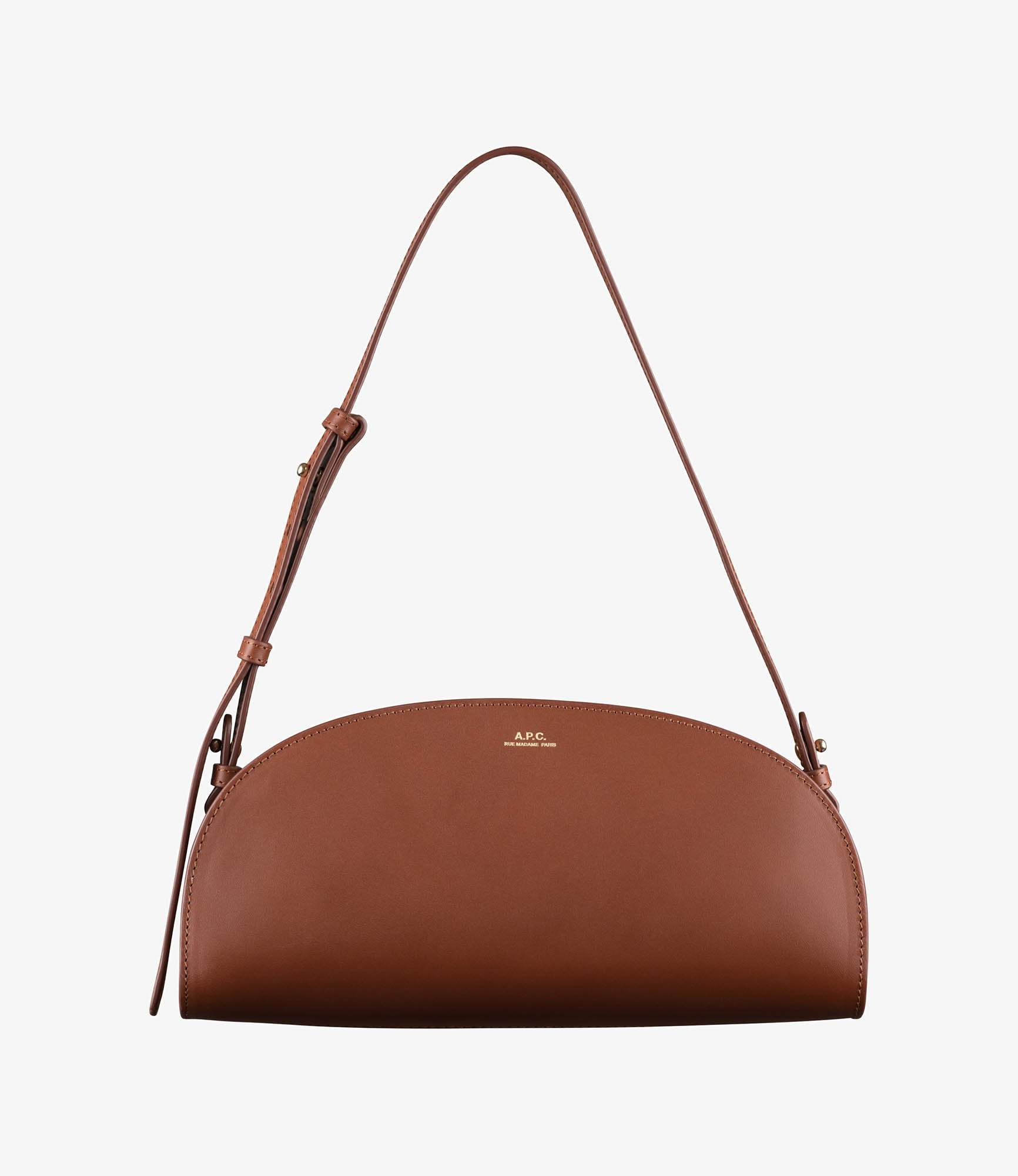 - Iconic A.P.C. bag in a longer version to wear on the shoulder. - Zip closure with double leather pull tabs. - Shoulder strap adjusts with a metal buckle. - Can be worn on the shoulder or across the chest. - Inside pocket. - Goldtone rivets on the sides. - Embossed goldtone A.P.C. Rue Madame Paris logo. Size Advice - Cotton lining. - Dimensions: 27 x 12.5 x 7.5 cm. - Shoulder version of the Demi-Lune bag. Composition & Material - 100% cowhide leather. - Spanish material. - Made in Morocco. - Care instructions: wipe with a soft dry cloth.