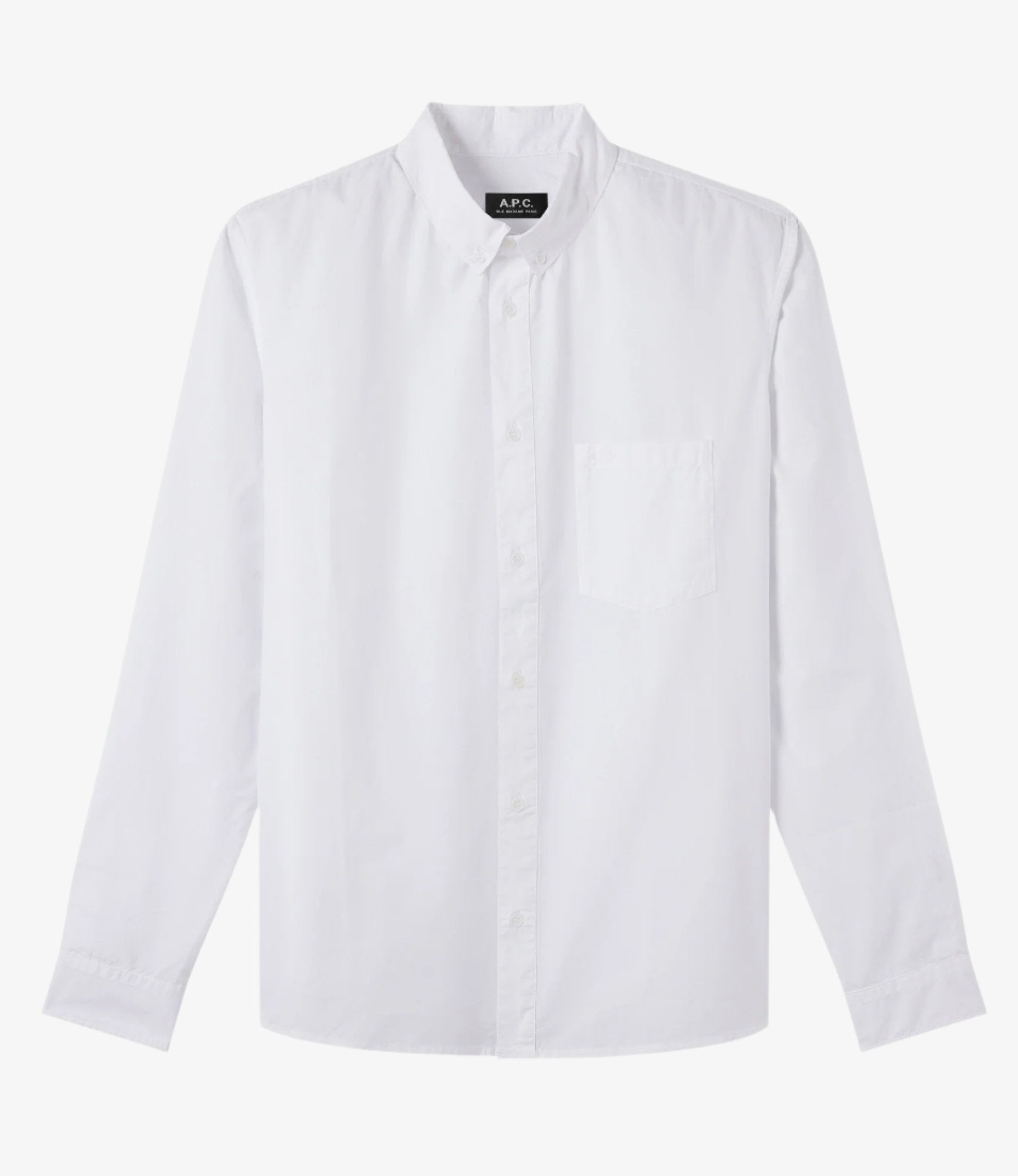 A.P.C. Men's shirt. - Straight cut. - Slightly sloping shoulders. - Button-down collar. - Pocket on the heart. - A.P.C. logo embroidered in tone-on-tone on pocket. Size Advice - This item sizes normally. - We recommend that you select your usual size. Composition & Material - 100% cotton. - Made in Tunisia. - Machine wash cold 65-85° F inside-out.