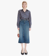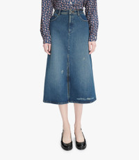 A.P.C. Women's skirt. - Mid-rise. - Flared cut. - Mid-calf length - The top of the skirt is designed like classic five-pocket jeans. - Large front slit. - Side and back pockets. - Zip fly. Size Advice - Ireen is 5'10 tall and is wearing size 36. Composition & Material - 100% cotton. - Egyptian material. - Made in Egypt. - Machine wash cold (86°F) inside-out.